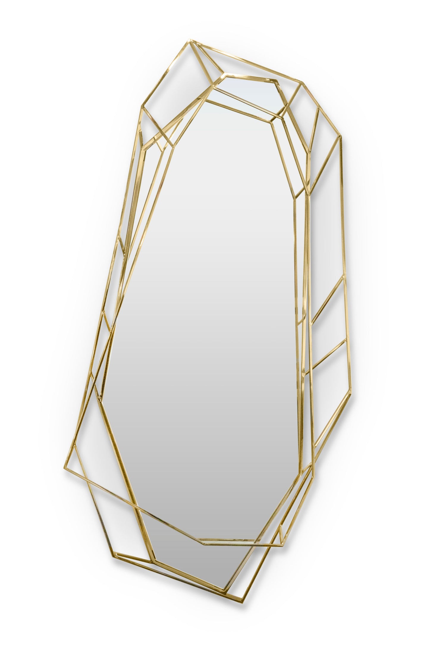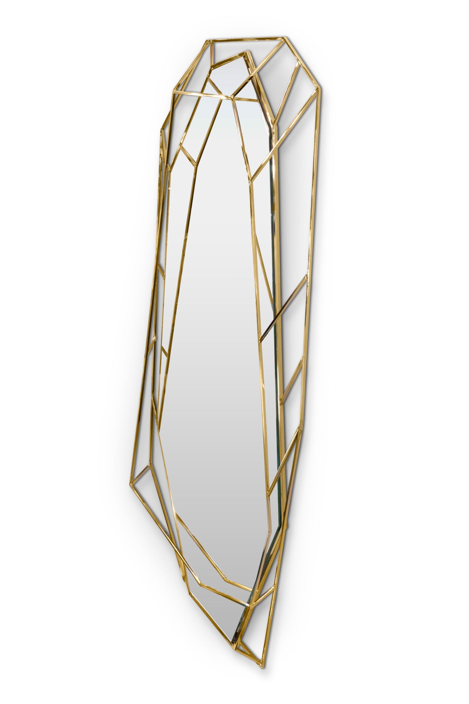 A full length version of the diamond shaped mirror which will add a luxurious and rich element to any interior. Crafted in a polished brass structure, it produces a tall sleek design, merging geometry and design in the same object.