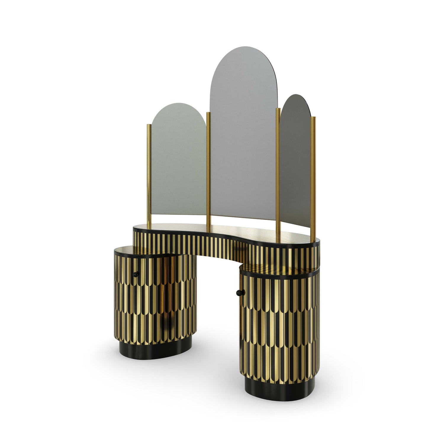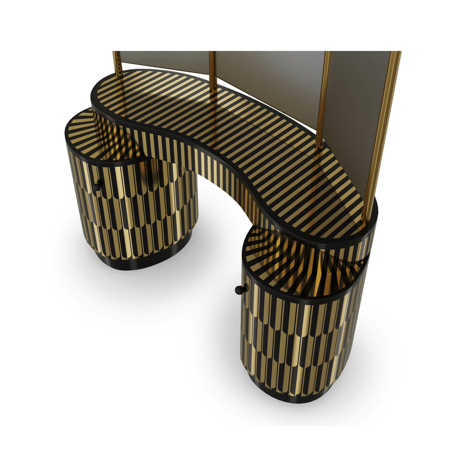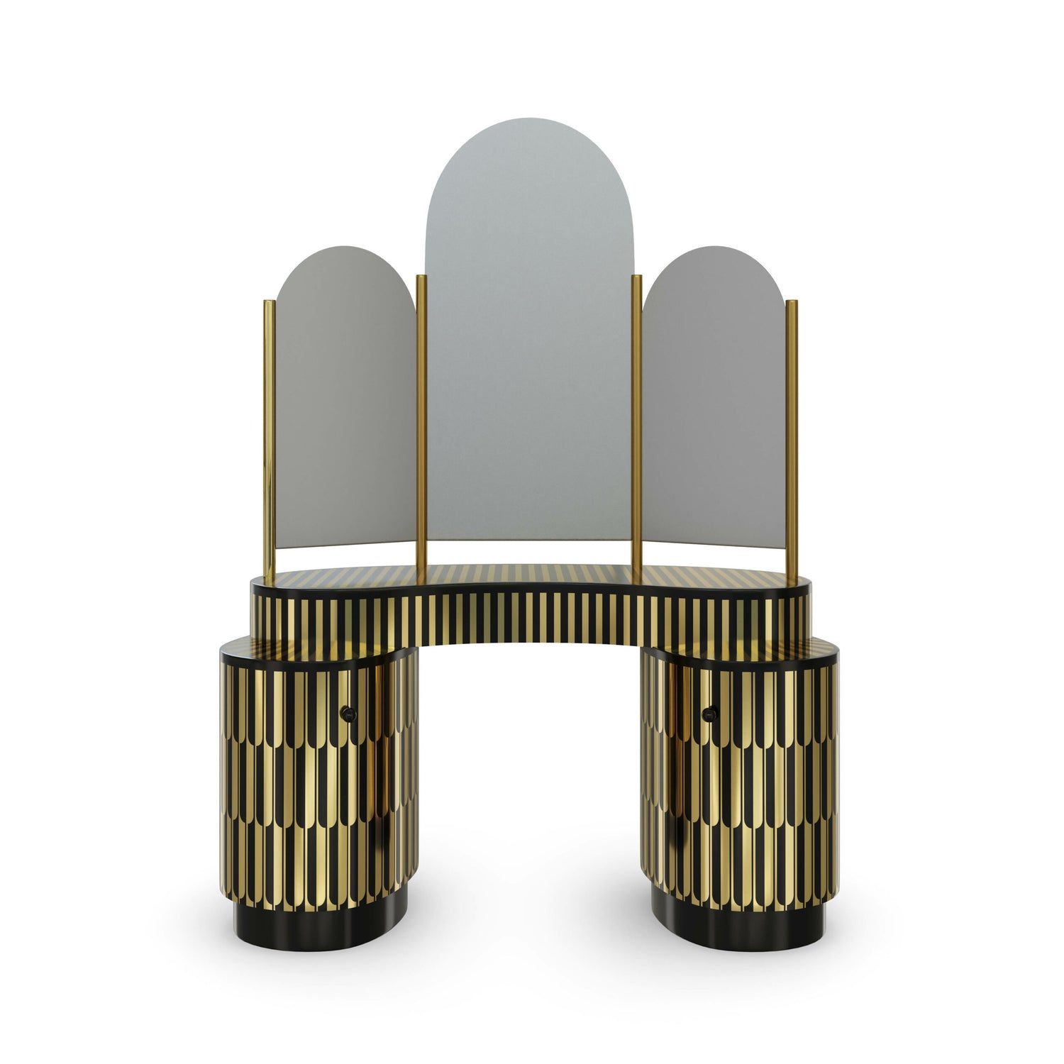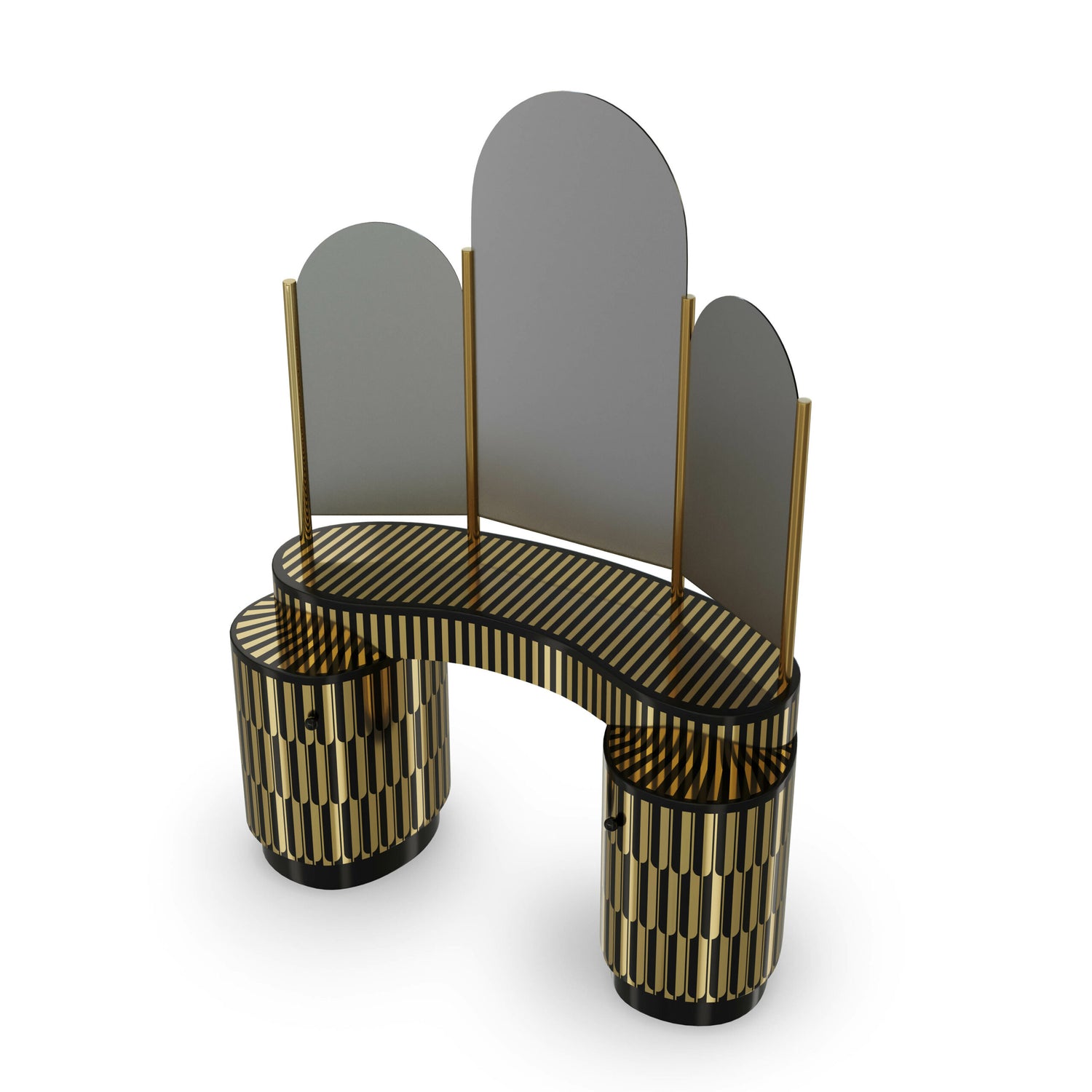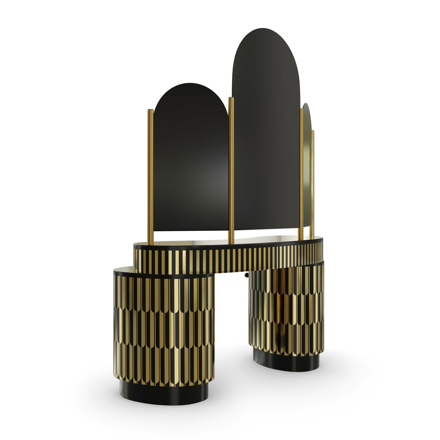 The Casablanca Black Gold is a luxurious vanity table, masterfully handcrafted with brass and resin inlay. Featuring three tall arch-shaped mirrors with gold trimmings, and an abundance of drawers and shelves, it offers both elegance and functionality for any sophisticated space.