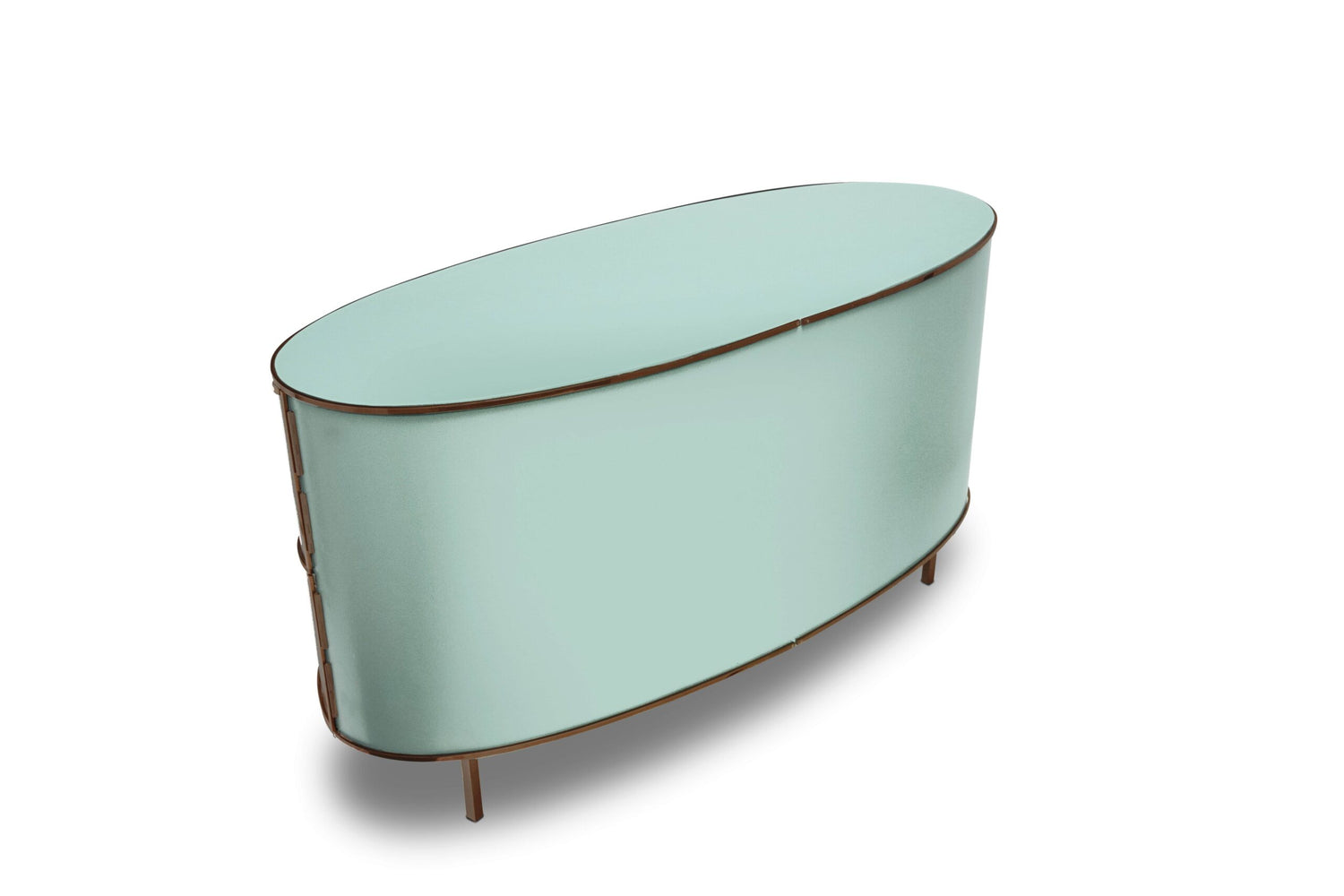 88 Secrets Sideboard Jade Rose is a mint green cabinet designed with sensuous, feminine lines and adorned with luxurious rose metal trims. A refined addition to any elegant interior.