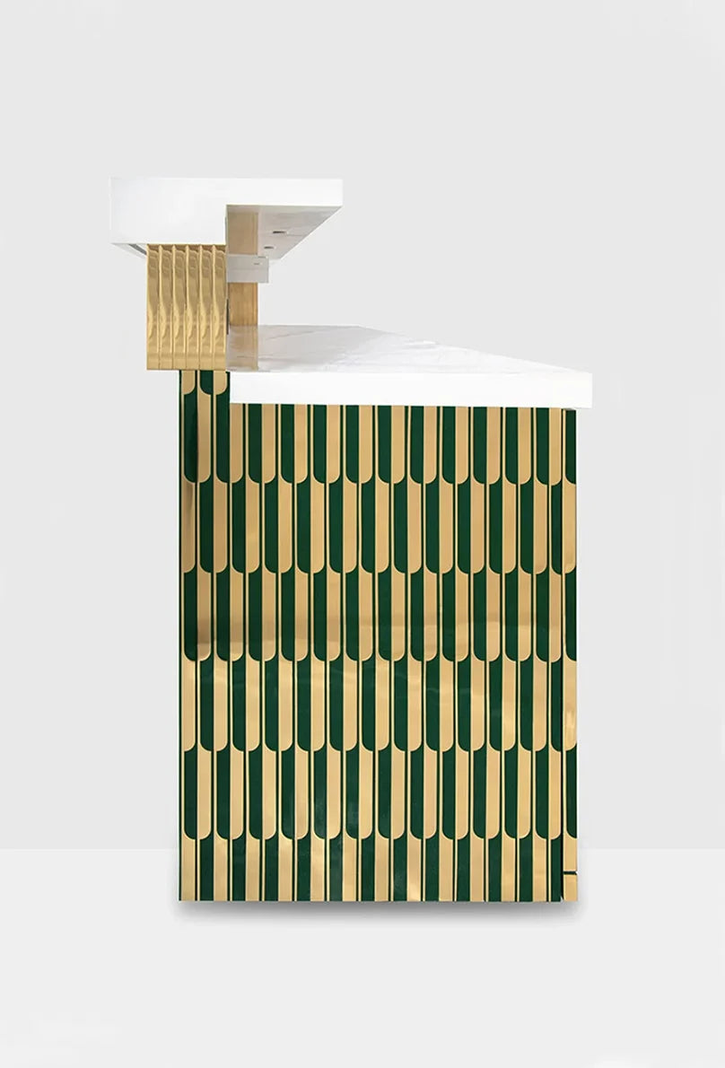 Alchemy Bar is designed in rich brass and resin inlay with drawers and shutters to hold a functional bar. The size can be customized to fit your space.