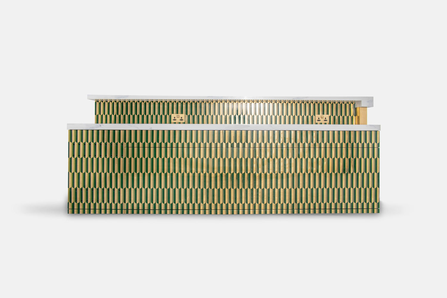 Elixir Bar is designed in rich brass and resin inlay with drawers and shutters to hold a functional bar. The size can be customized to fit your space.