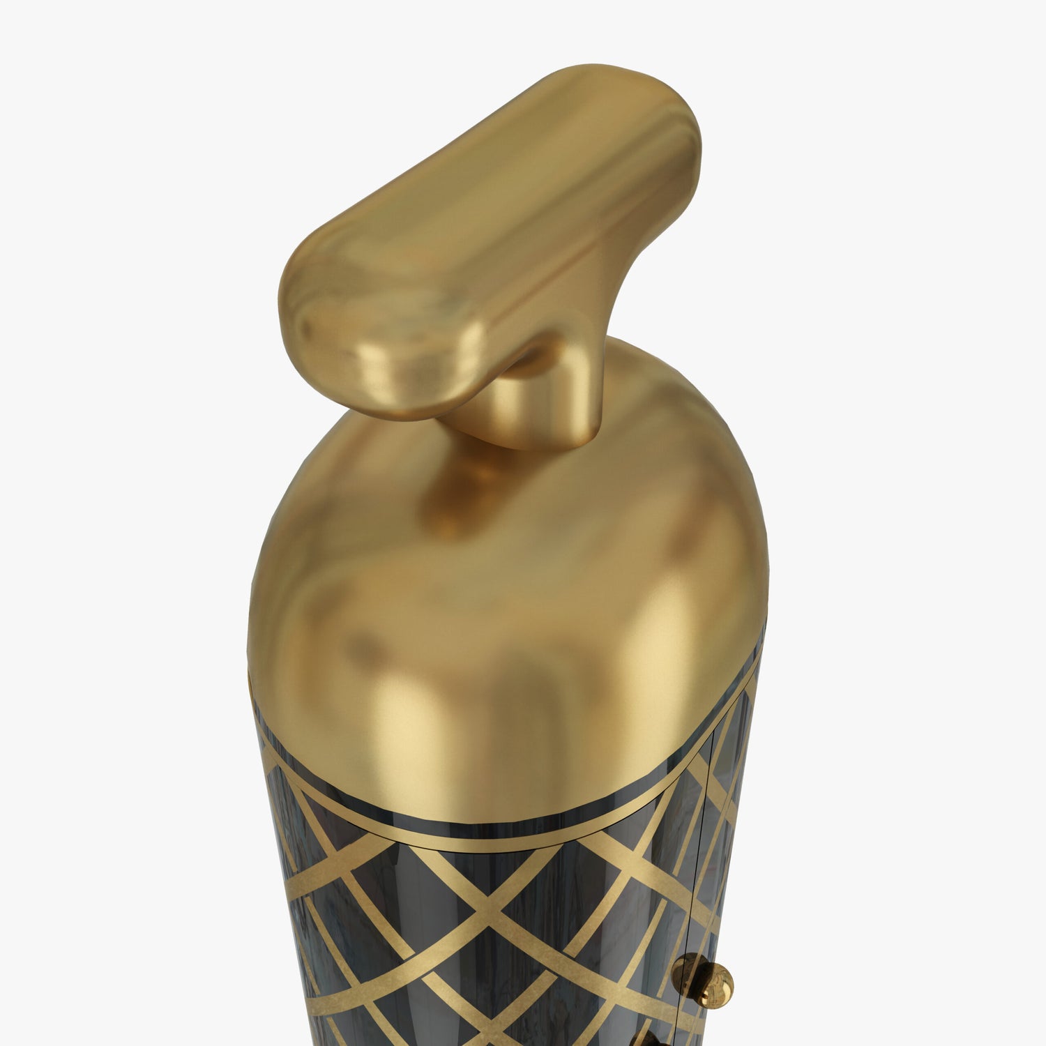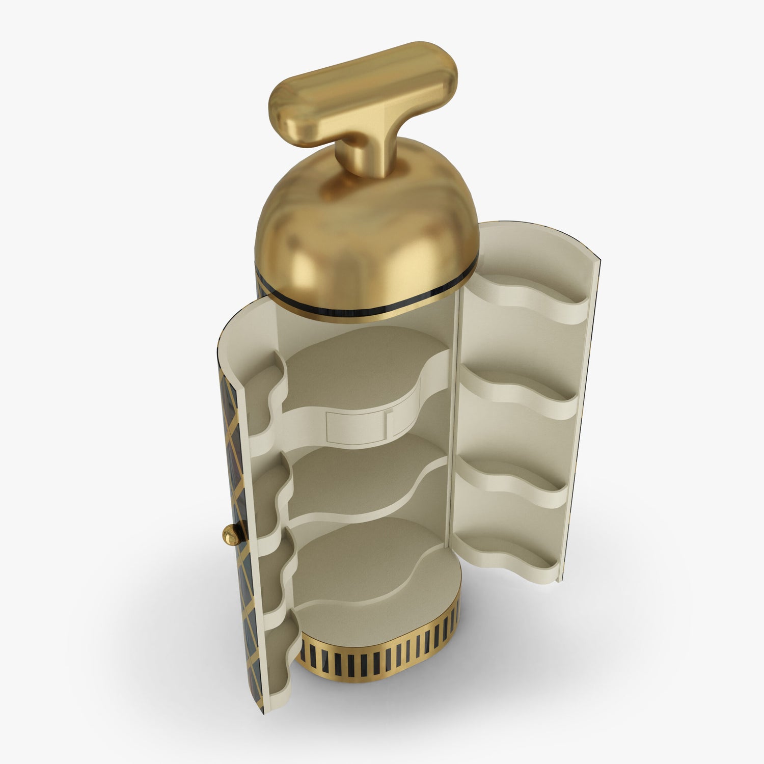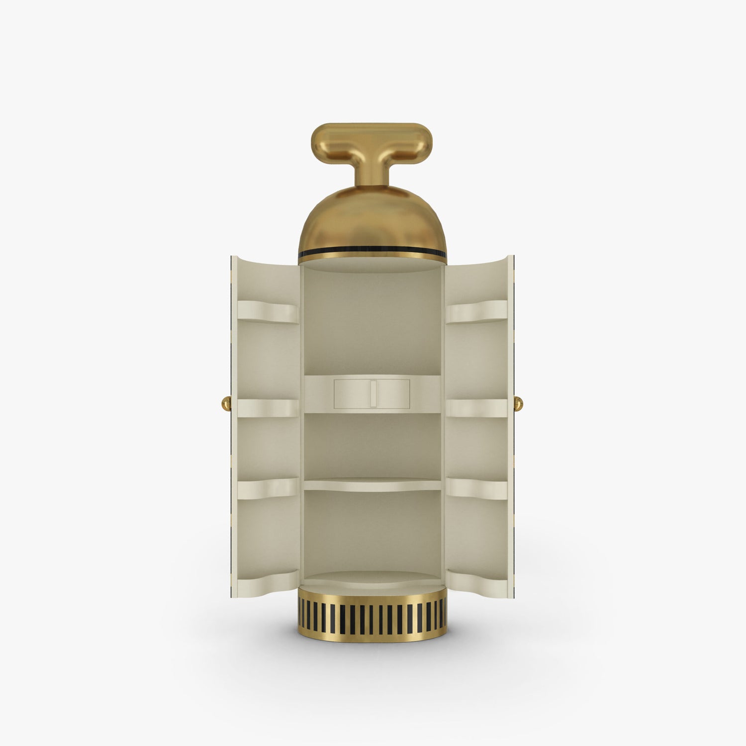 Monsieur Verdoux Black Gold is an exquisite cabinet, made with the finest brass and resin and plush ivory leather interiors, designed to hold a full bar.