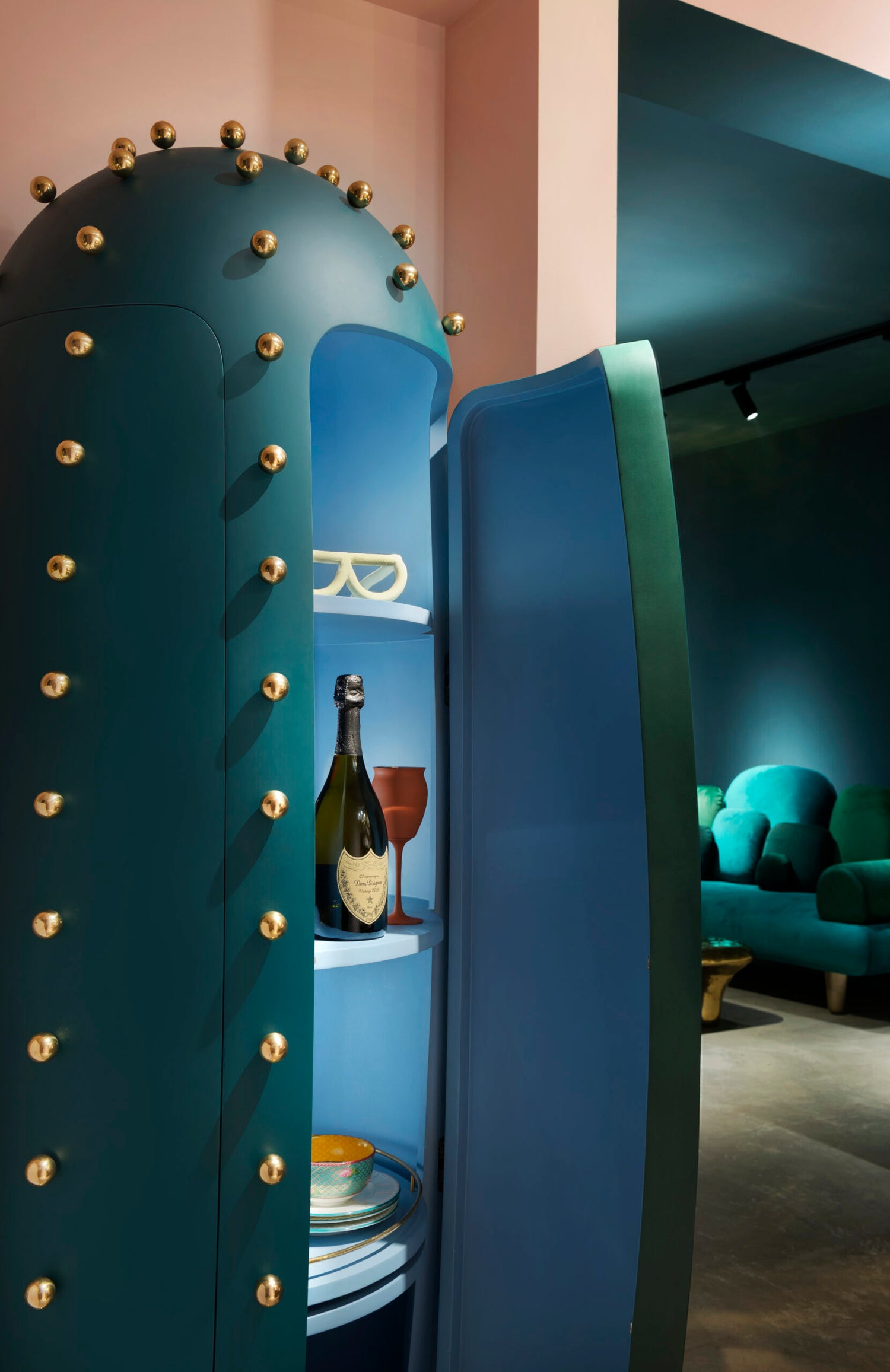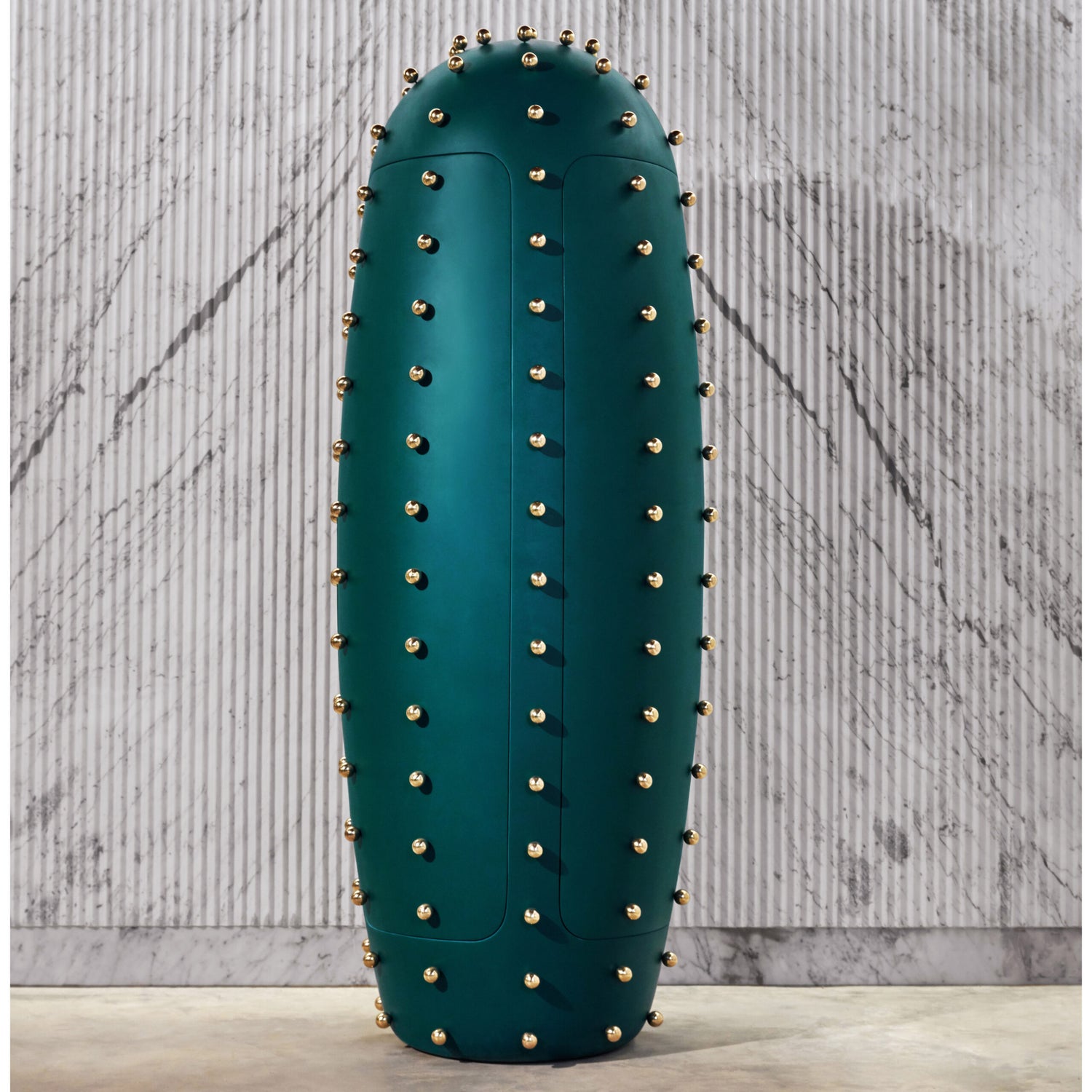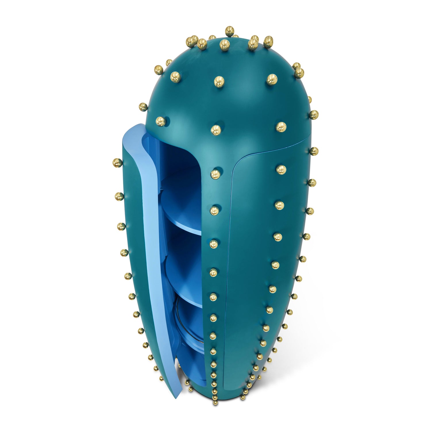 The Oasis Cabinet is a novel deep green cabinet with pale blue interiors. It is covered in gleaming brass spheres reminiscent of thorns on a succulent cactus.