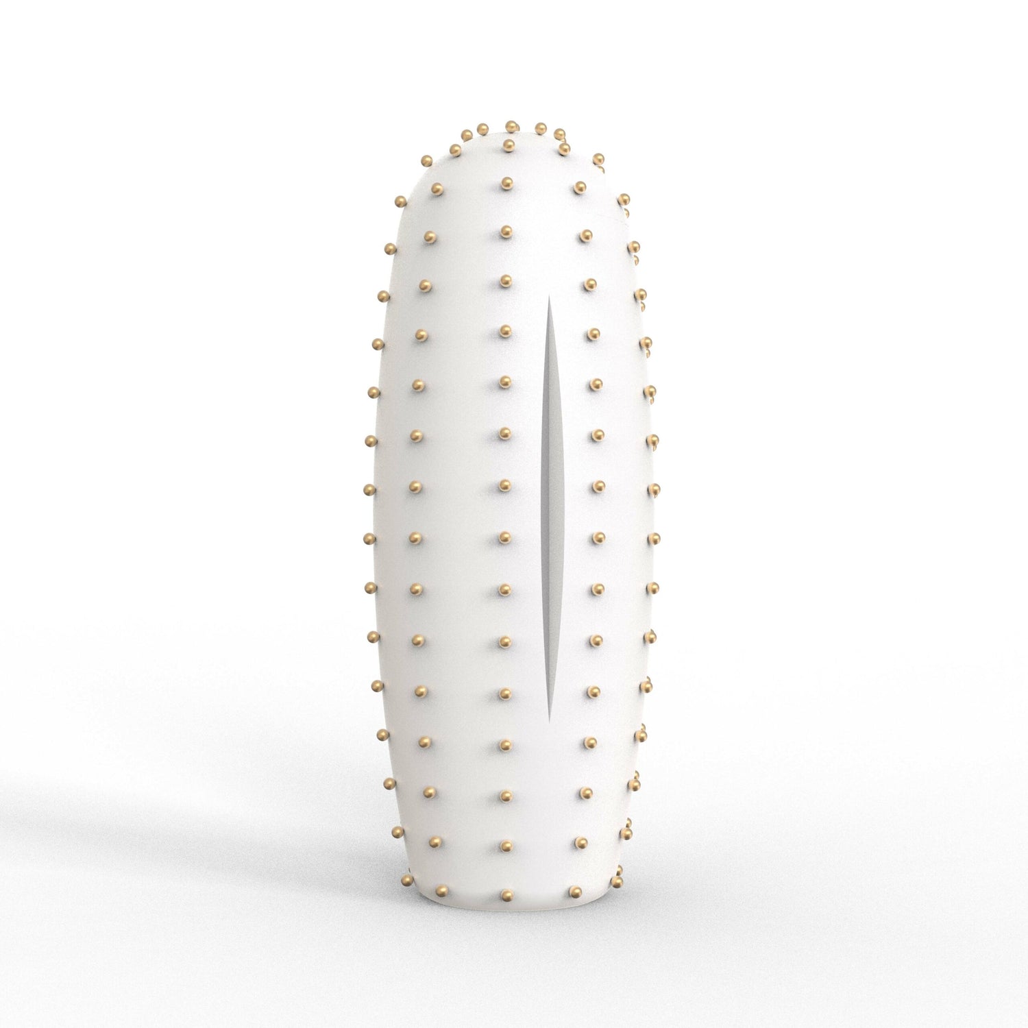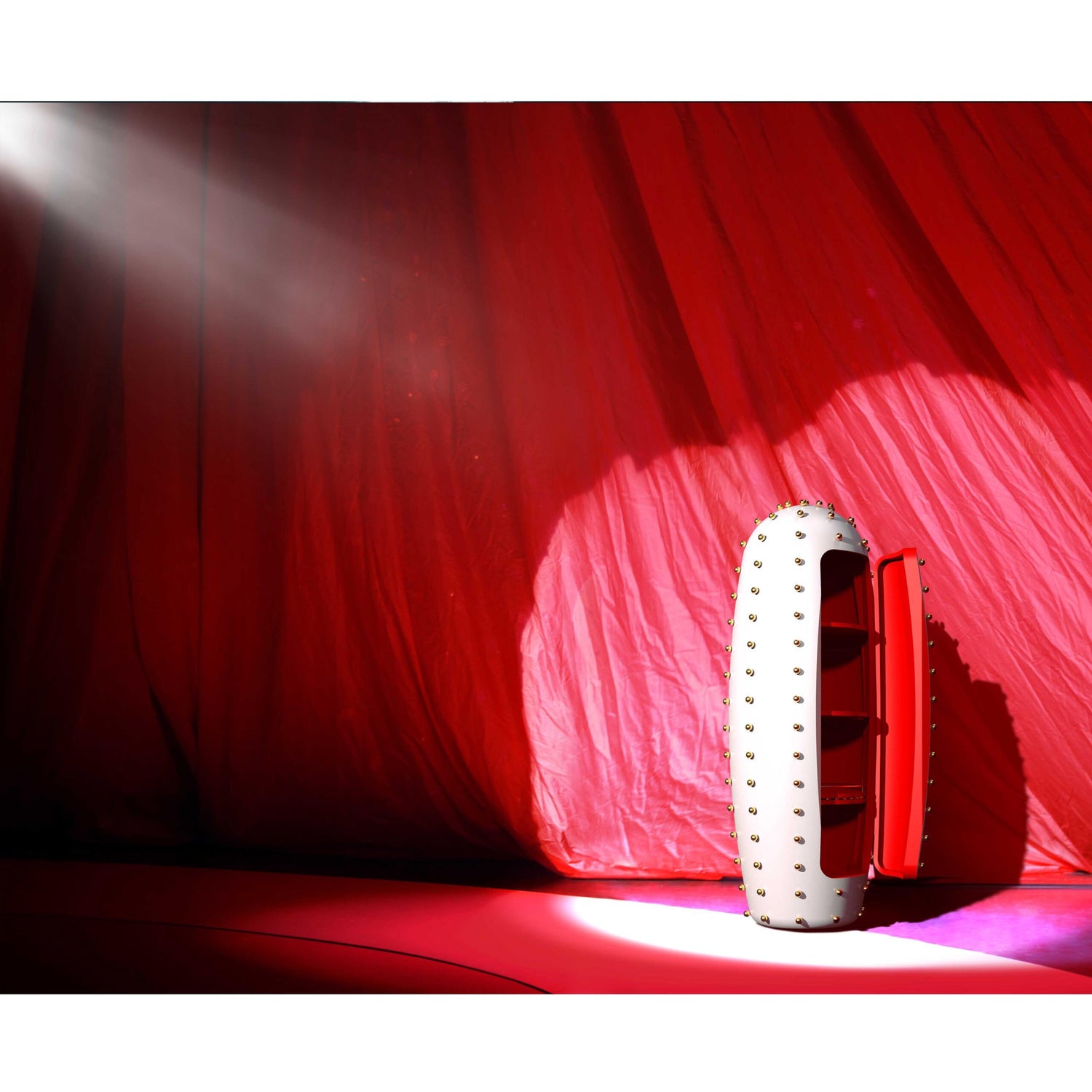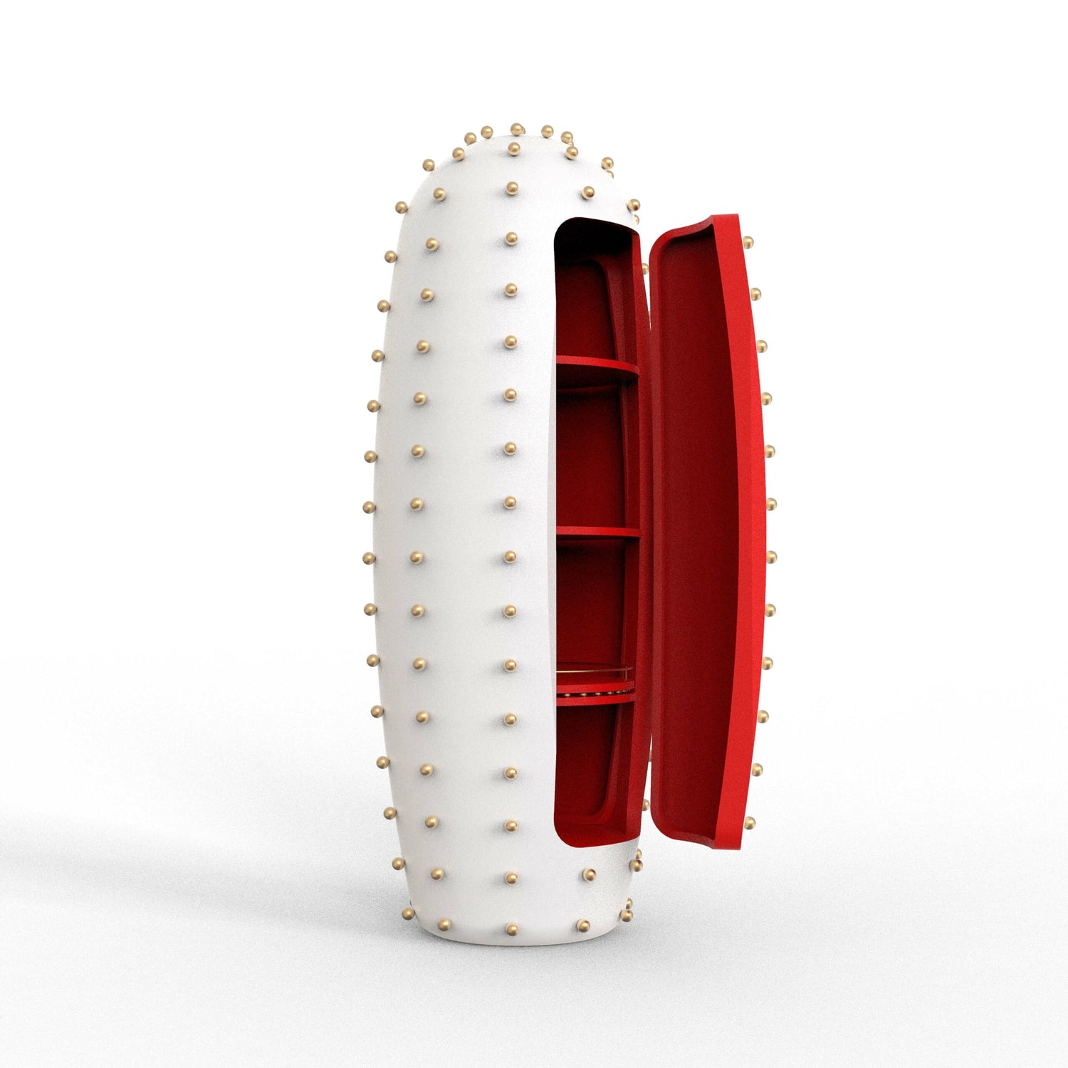 The Oasis Snow Cabinet is a pristine white cabinet with scarlet interiors. It is covered in gleaming brass spheres reminiscent of thorns on a succulent cactus.