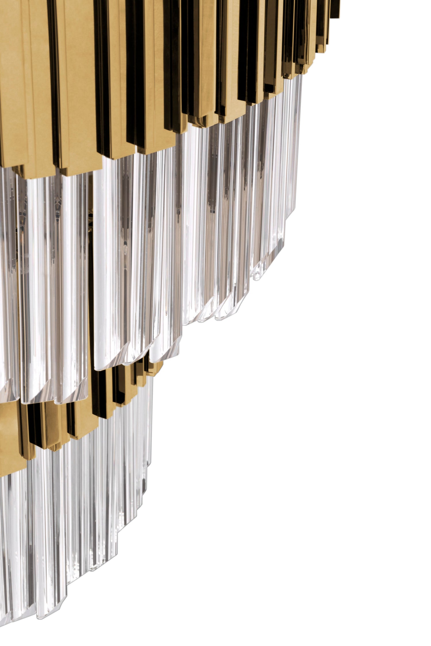 Empire II Suspension is born from the iconic lines of the Empire collection. A glamorous and extravagant crystal lamp that is the ultimate blend of classic and modern design. A suspension made with layers of gold plated brass and vintage-inspired crystal glass.