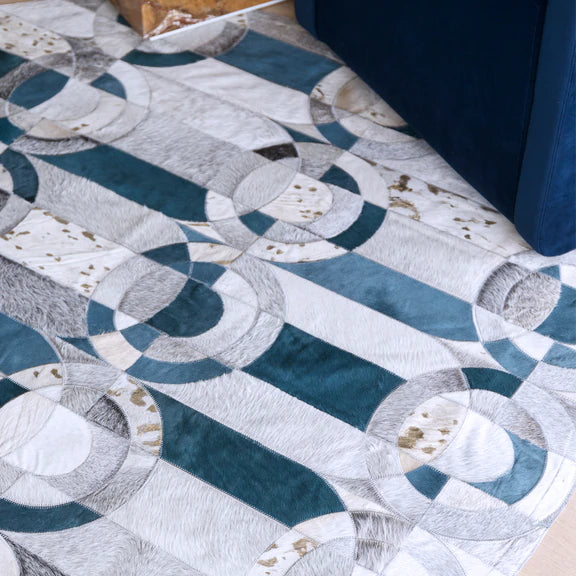 Art Hide's Curvo style has been a customer favorite since its release in 2020. With bold geometric lines and a striking mid-century aesthetic, the 2021 Jade Curvo continues to impress. This rug features irregular sections of light and dark jade on a base of tonally varying natural grey hide, enhanced with glittering gold accents to highlight its natural beauty.