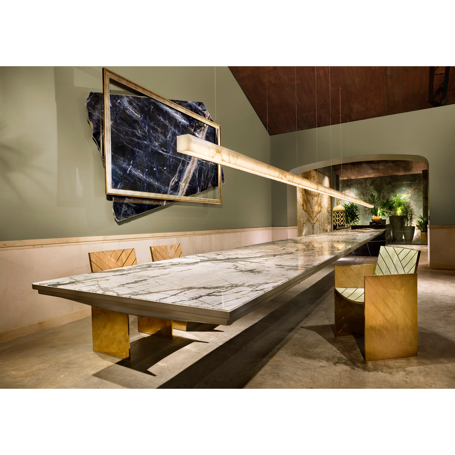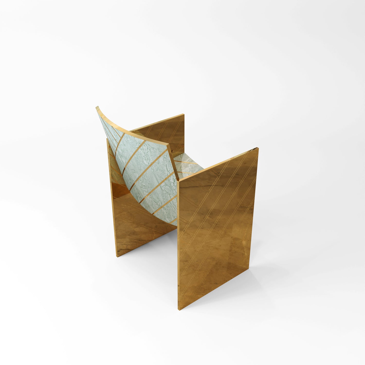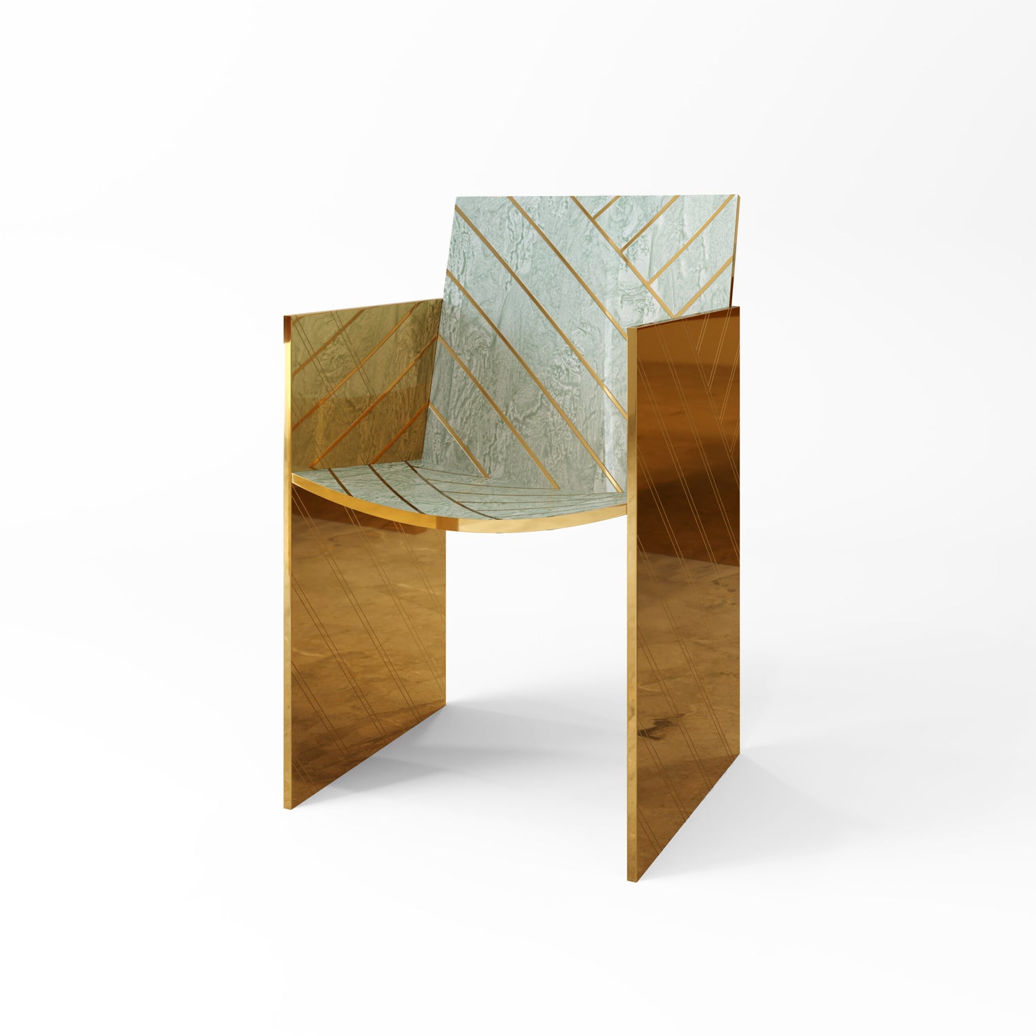 Nesso Dining Chair is a beautiful chair in pearly resin with geometric brass inlay. It can be matched beautifully with the Nesso Dining Table.