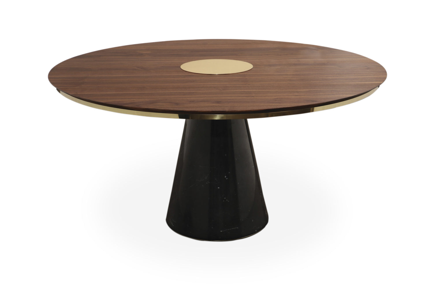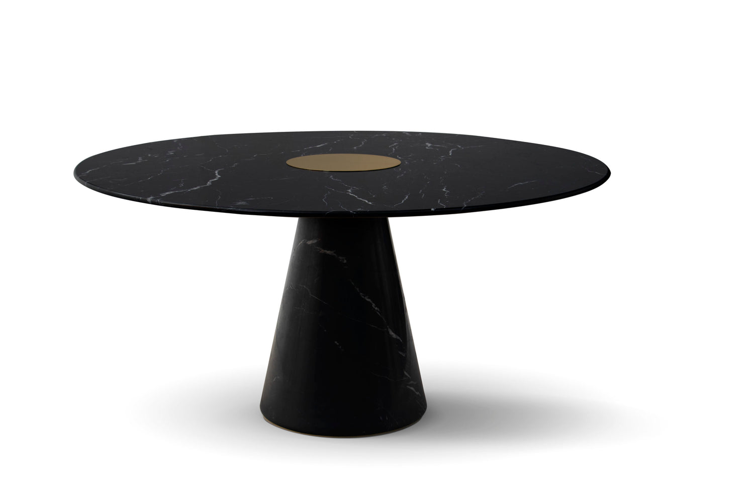 The Bertoia Round Dining Table is a modern piece perfect for smaller spaces. Its round shape is not only trendy but also enticing. Crafted from dark marble, this majestic dining table brings out the best in your dining room decor.