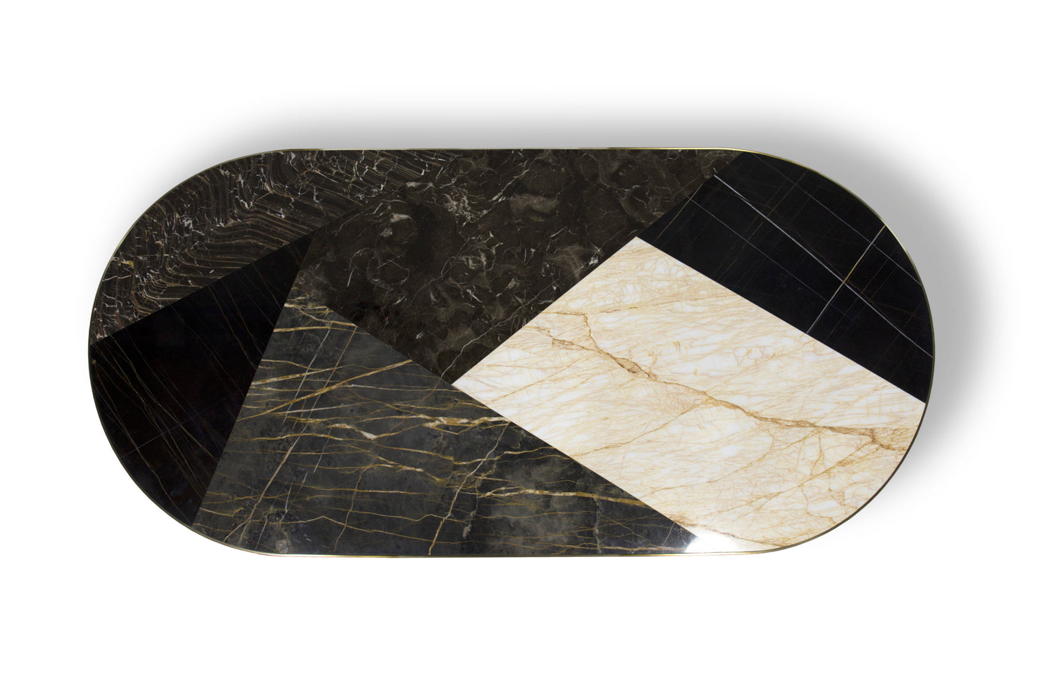 Coupled with a stunning satin brass base, the striking, geometric patchwork marble top conveys a sense of bold elegance to any dining area. Dine lavishly in the presence of Decodiva.