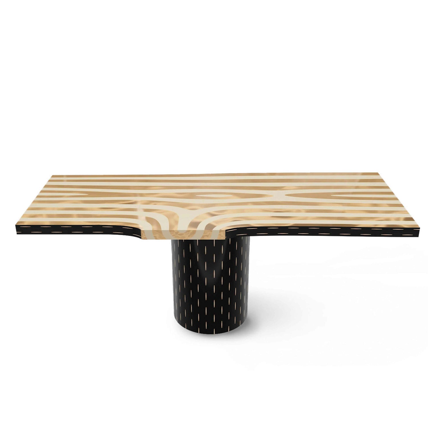 Brass inlay resembles the natural beauty of wood on the top of Forest Dining Table, which is poised on a lovely handcrafted base with brass details.