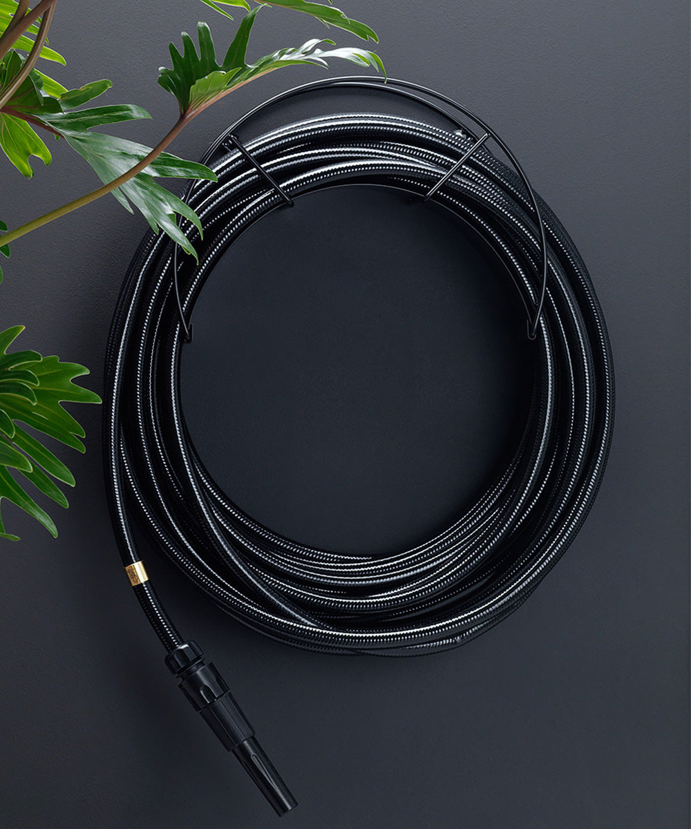 This kit contains a Black Swan garden hose, a matching wall mount, and a nozzle set in black.