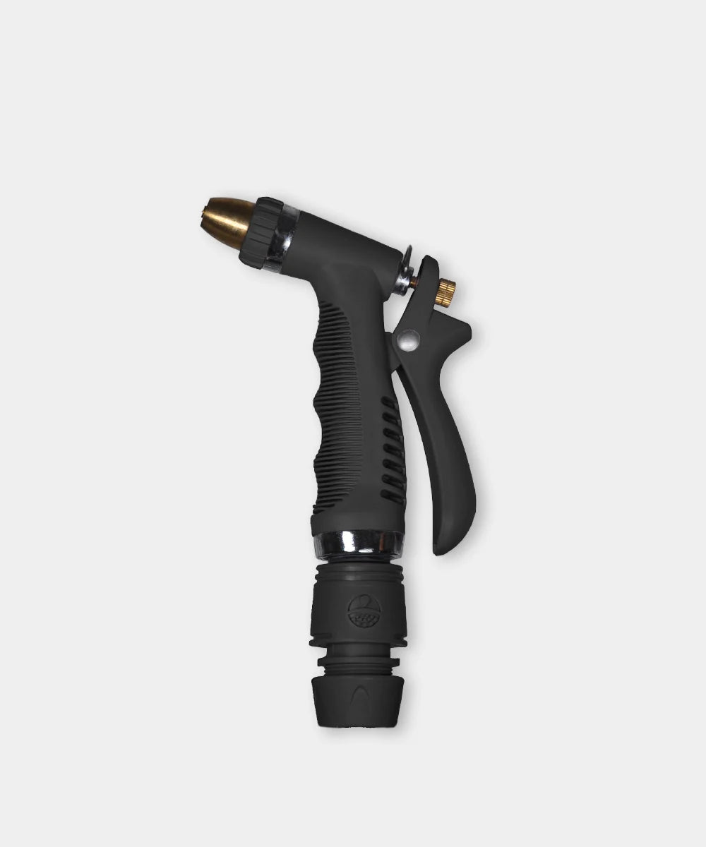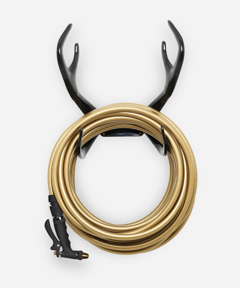 The black reindeer shaped hose rack is designed and manufactured in Sweden, it is made of aluminum and endures rough weather. They come with a 5-year warranty. The Gold Digger garden hose has a knitting reinforcement around the inner tube which makes the hose pliable and non-kinking as all our coloured garden hoses. The plastic surface is dirt-repellent and UV-protected to prevent bleaching from sun exposure, so your garden hose will keep its perfect color for years and years. All hoses are made of PVC and free from lead, cadmium and phthalates. The roses will sing while the hose is spoiling them with lots of clean water.The hose comes in 20 meter / 65 feet, If you need longer, easy – just buy an additional one. We provide you the extension connector for free.The black trigger nozzle is compatible with all ½” water hoses and comes with fittings compatible with taps worldwide.