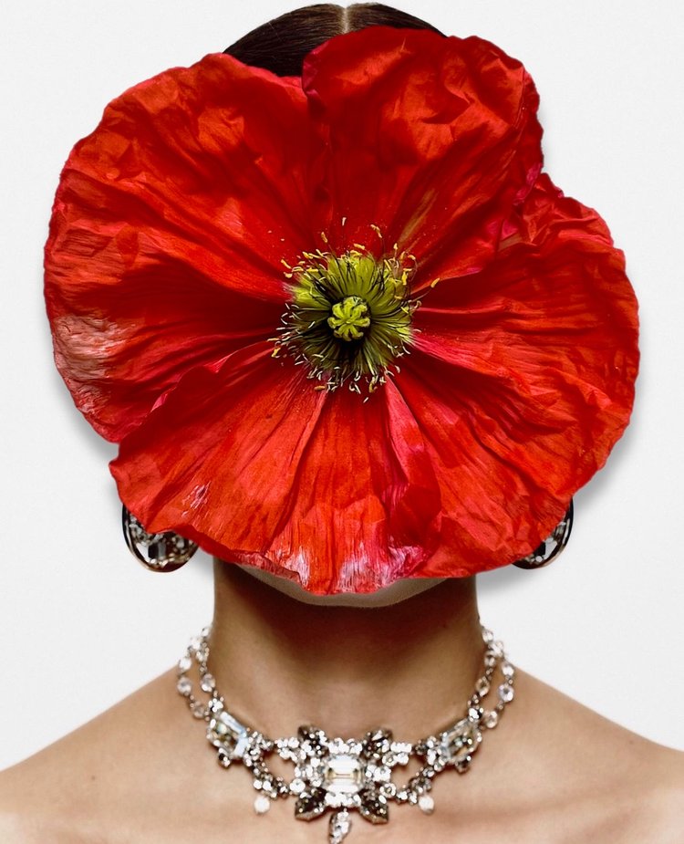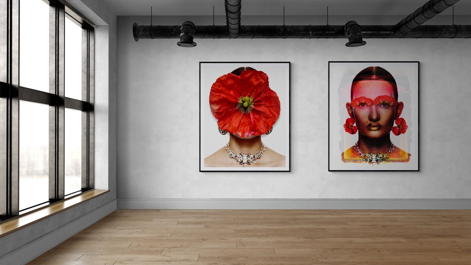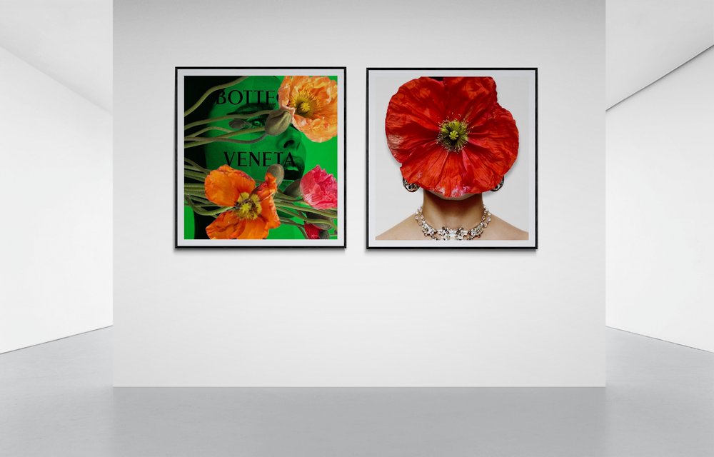This is an original artwork by Amanda Johnstone using digital collage and layering. The source image is unknown, taken from a magazine, and enhanced with flower petals and paint drags on a palette, then overlayed for a unique composition.