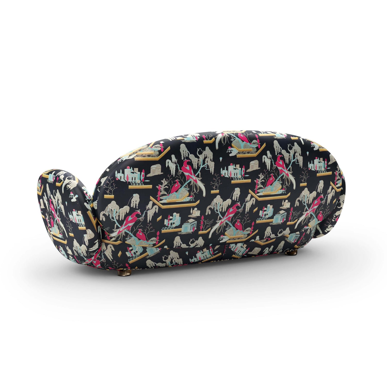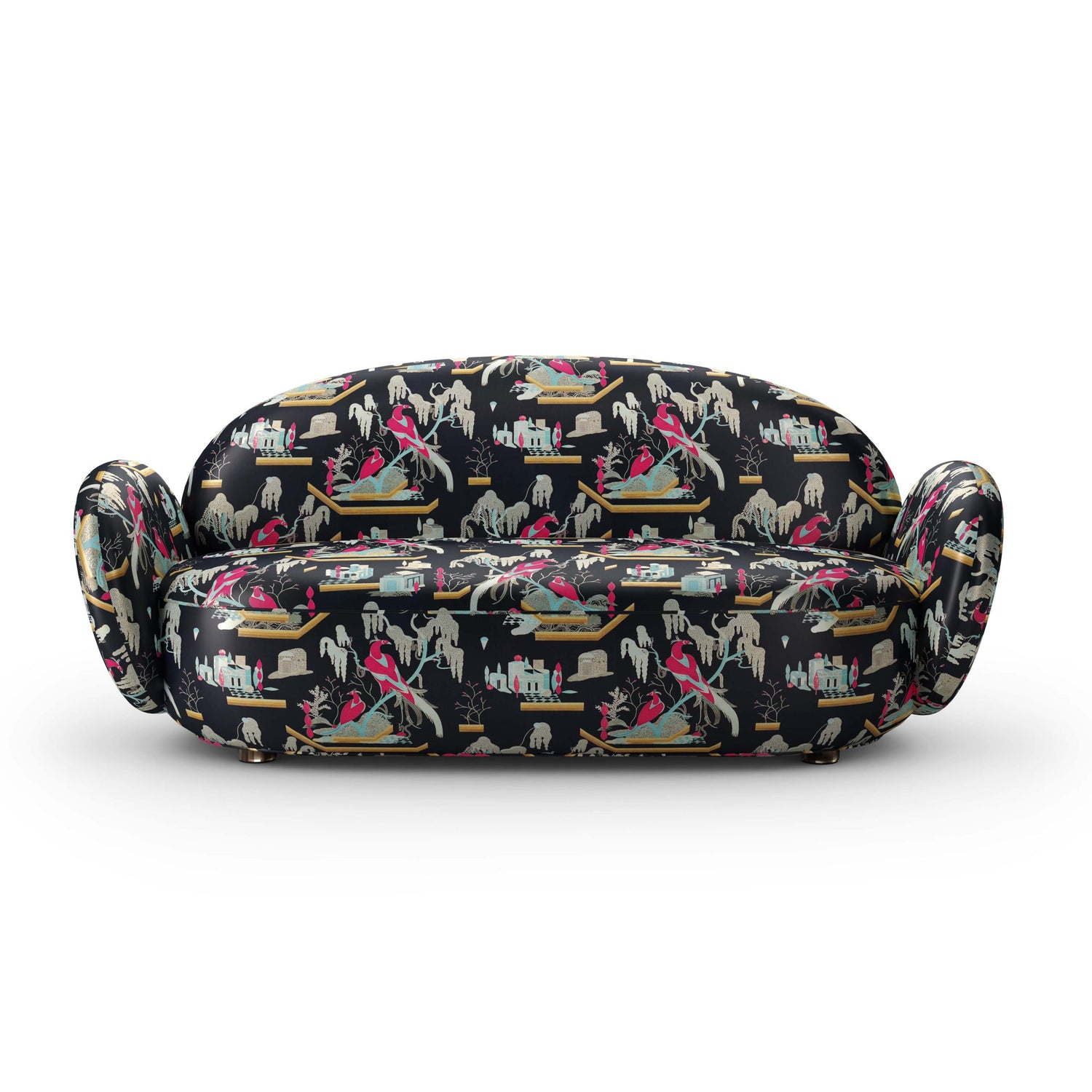 The Dolce Sofa is an exquisite and ergonomically perfect three-seater sofa, upholstered in the plush black-pink jacquard fabric, This Must Be The Place by Dedar Milano. Ideal for playful lazing!