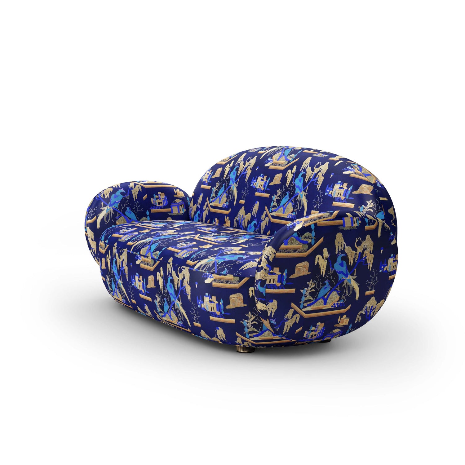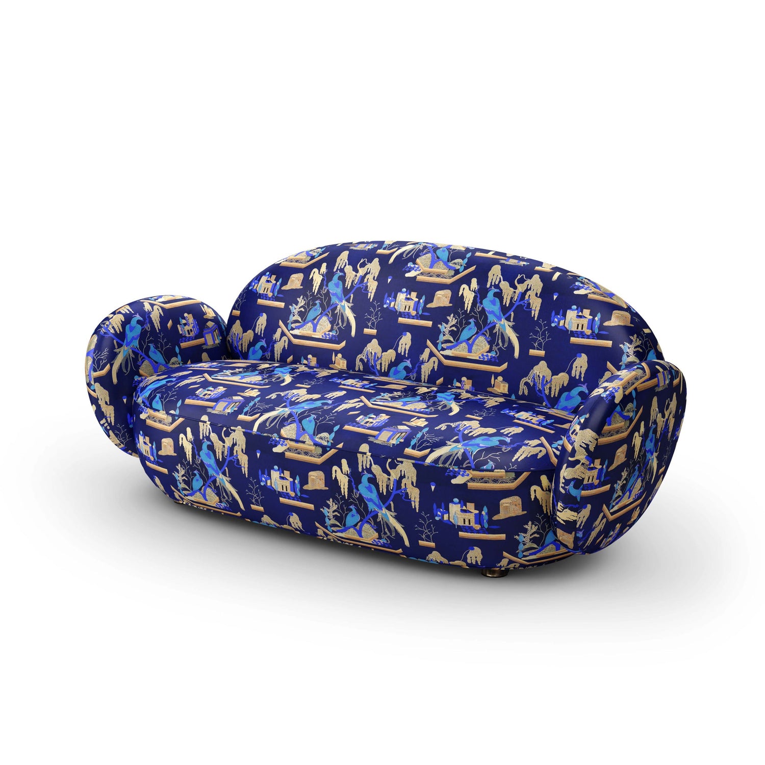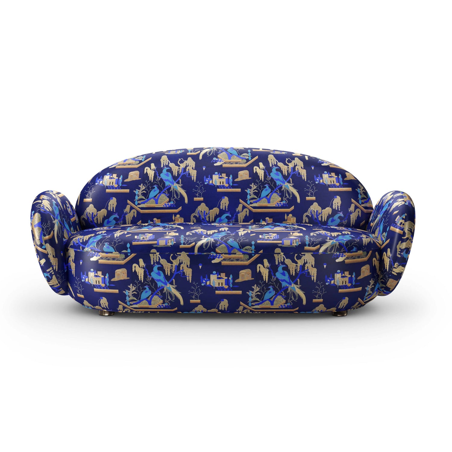 The Dolce Sofa is an exquisite and ergonomically perfect three-seater sofa, upholstered in the plush blue jacquard fabric, This Must Be The Place by Dedar Milano. Ideal for playful lazing!