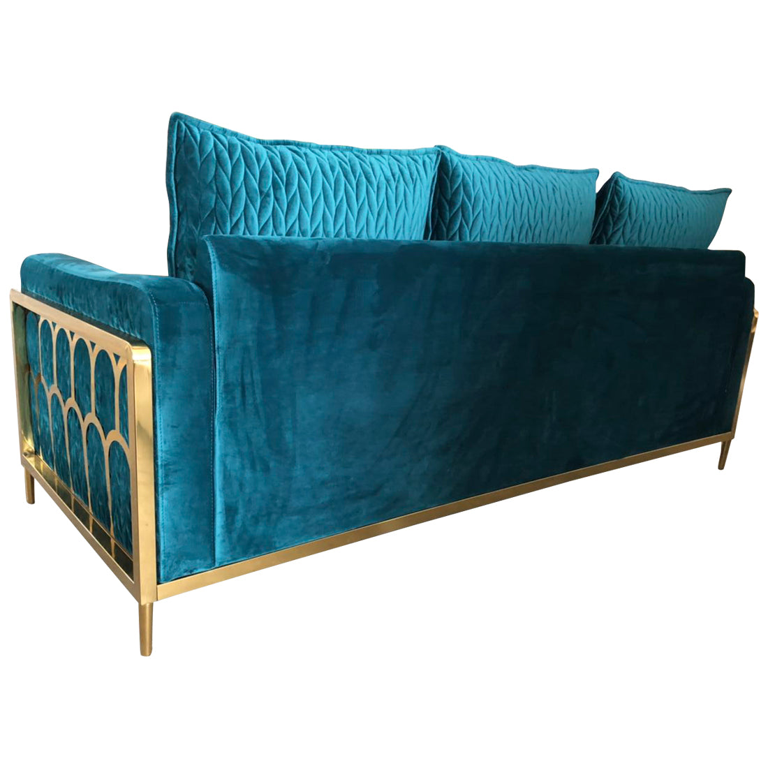 Soft luxuriously upholstered with soft velvet and a shiny polished gold frame. Features beautiful gold metal detailed frame pattern on each armrest. An elegant yet subtle addition to your living room or commercial interior. Backrest cushions are detailed with matching velvet in a leaf stitching design, adding further elegance and sophistication. Can be customized to any velvet colour preference. Please email us a swatch of your desired colour following purchase at info@cocolea.com.au or enquire to view other available colour selections.