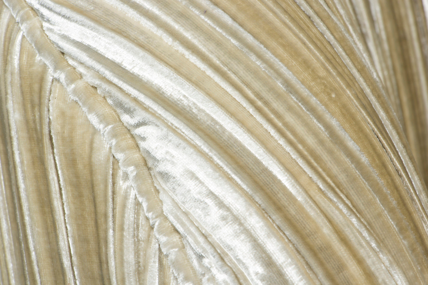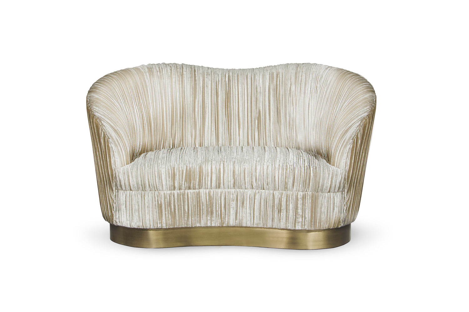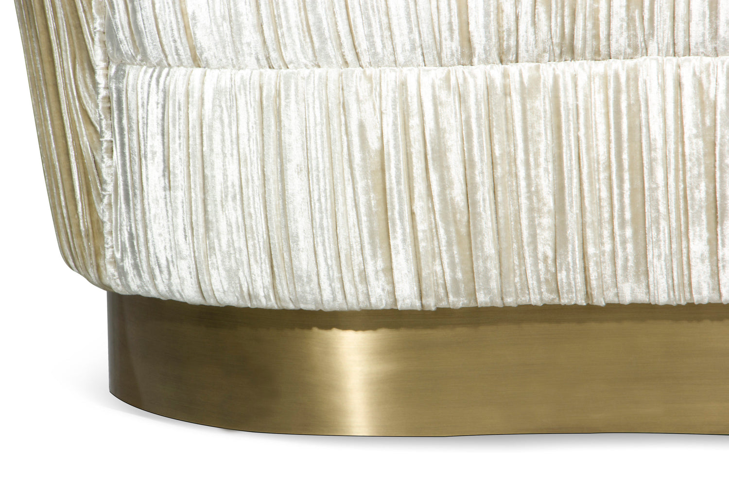 The lux and bodacious Kelly 2 seat sofa is the cool girl sipping Cosmos in the dark corner of a chic NYC lounge. Her fluid curves are harmoniously matched by sumptuous pleated waves of soft upholstery fabric. Her tell is a striking metal band hugging the base of her curvaceous body, leaving you constantly searching for a golden glimpse of her copious beauty.