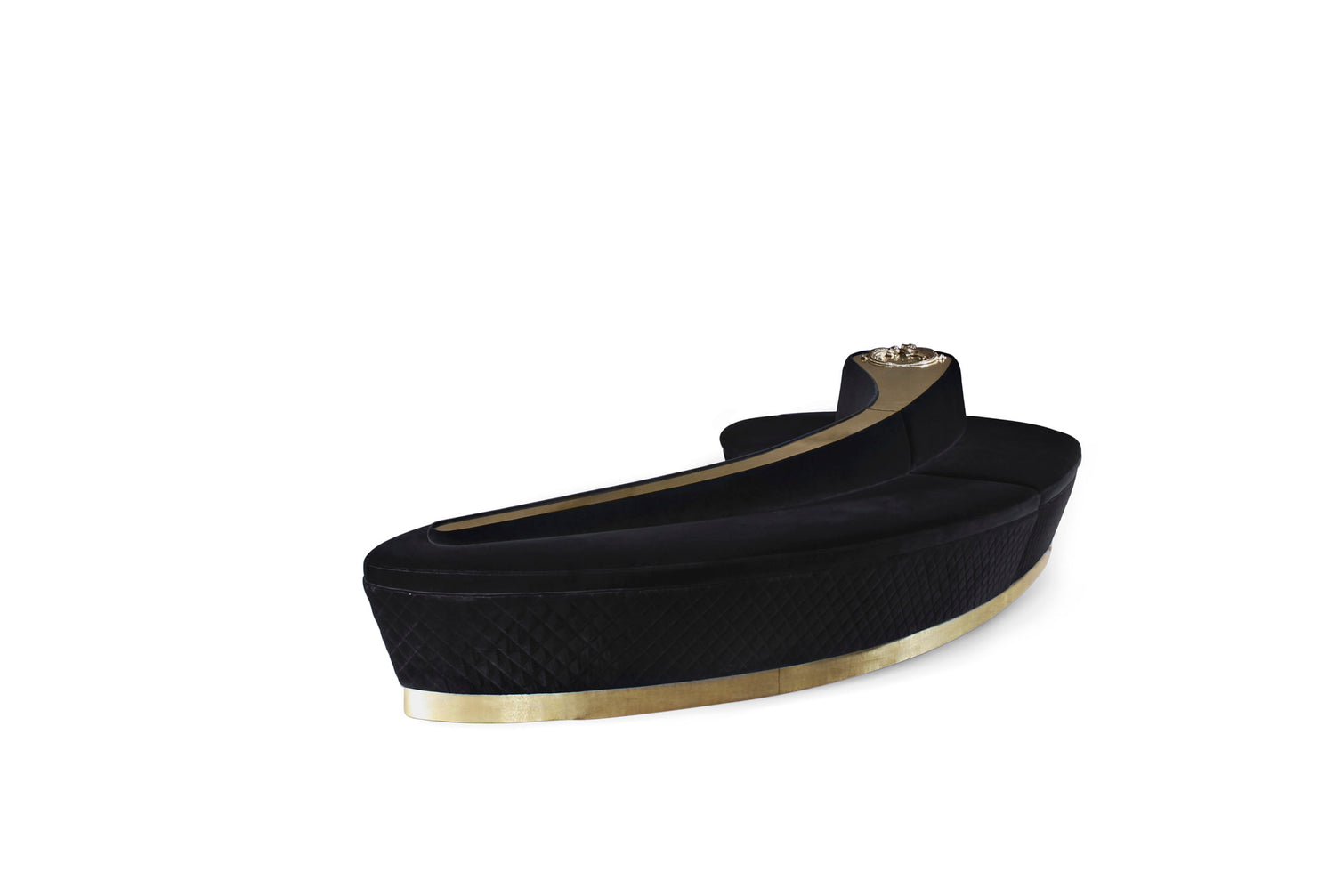 Revisit your animal fetish with this bold reptilian inspired sofa. Glorious lux black velvet upholstered curves are crowned by a meticulously hand carved crocodile. Each scale is delicately covered in gold leaf giving this fierce reptile a touch of the past. All supported by a polished brass frame.