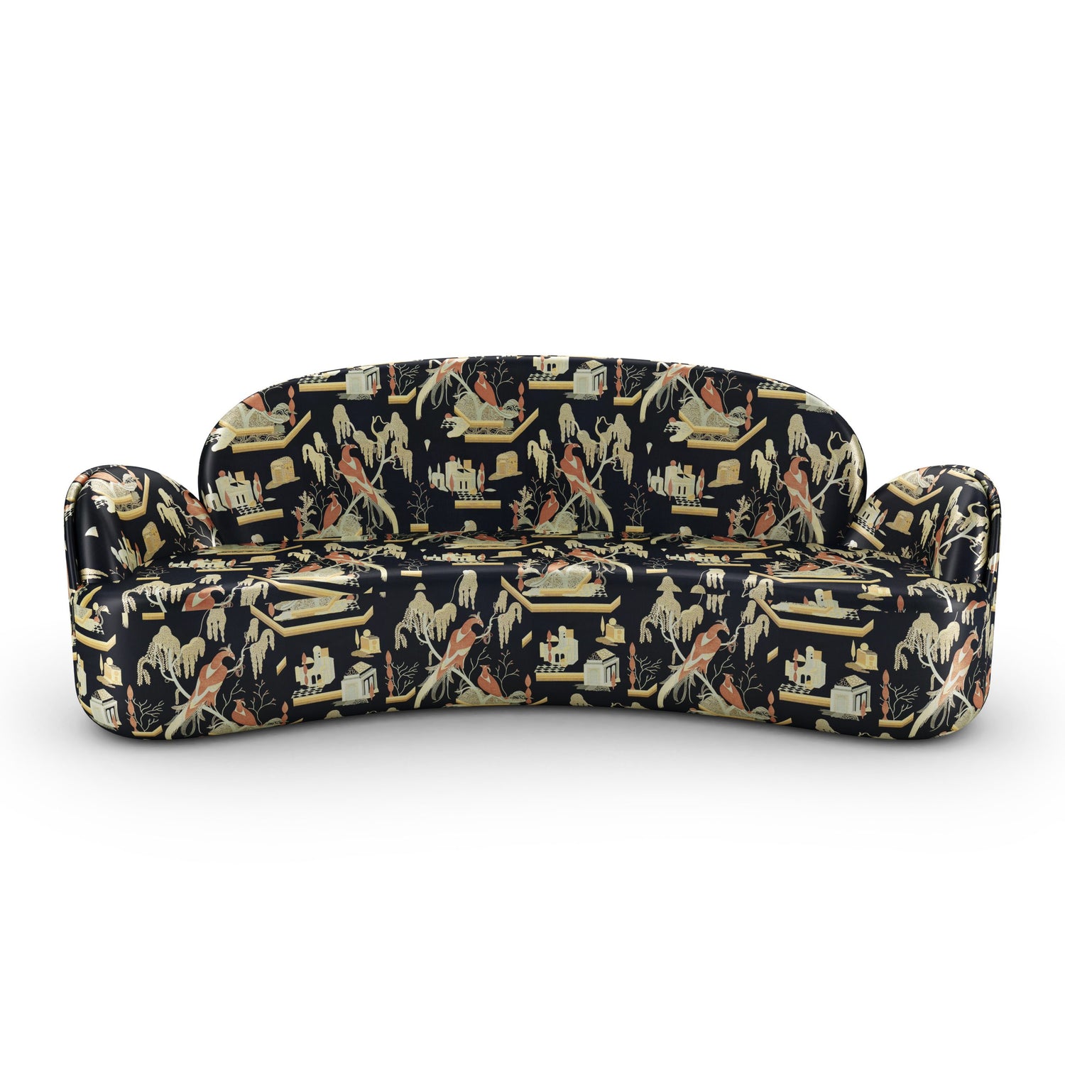 Strings Sofa is an elegant and ergonomically perfect three seater sofa with gorgeous curves. It is upholstered in the plush black-beige jacquard fabric, This Must Be The Place by Dedar Milano.