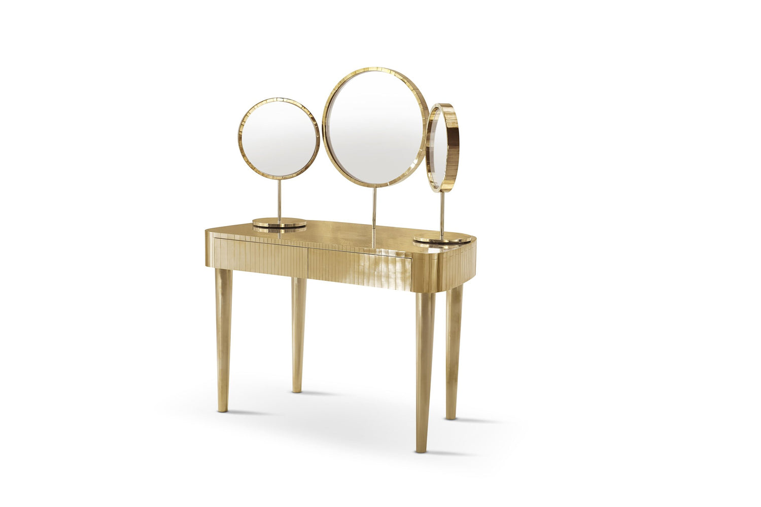 Woman in Paris Oro is an opulent vanity table with brass inlay. It has two drawers and three mirrors, two of which can be moved to desired angles