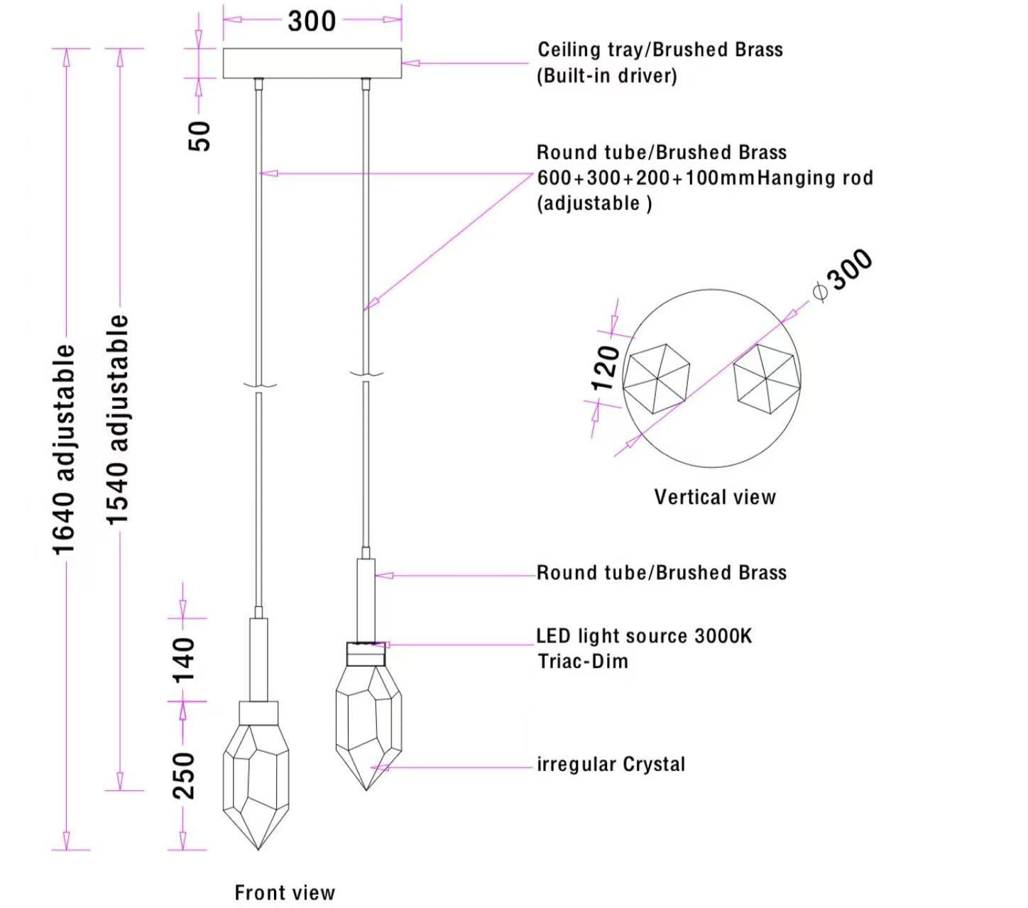 Each pendant is meticulously positioned so the second crystal hangs 140–150mm higher than the first, achieving a perfectly balanced asymmetry.