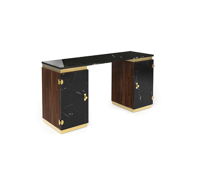 The Lasdun Desk is a sophisticated writing desk featuring two cubic towers crafted from varnished walnut veneer, with doors made from polished Nero Marquina marble. Brass details enhance its design, producing a soulful and sleek visual aesthetic.