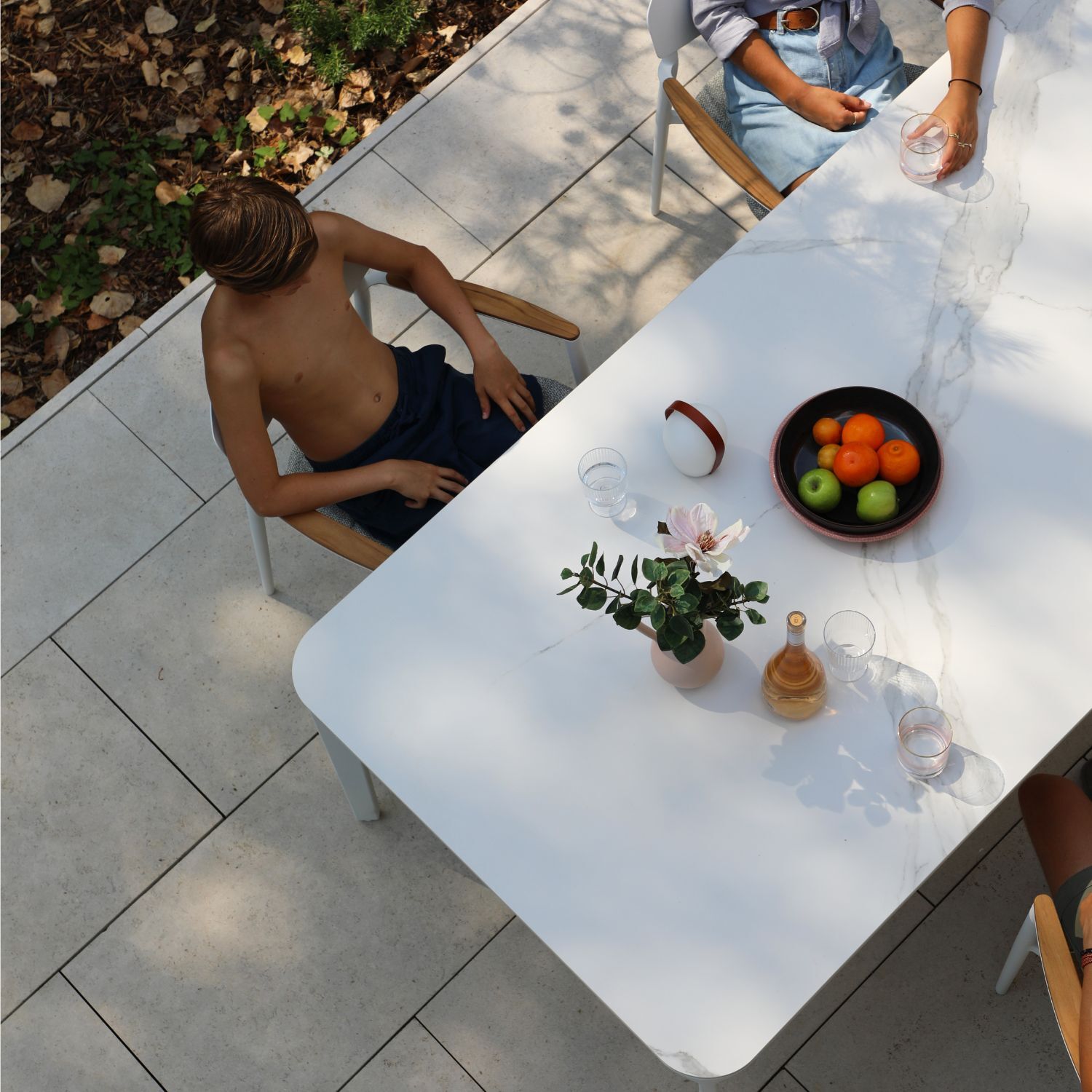 Embrace sophisticated outdoor dining with the Marco Ceramic Dining Table. Designed for both elegance and durability, this table seamlessly blends modern aesthetics with practicality. Its slender frame and sleek ceramic top create a refined yet functional surface, perfect for hosting intimate meals or grand gatherings. The elegantly curved edges add a touch of grace, ensuring it stands out as a statement piece in any outdoor space.