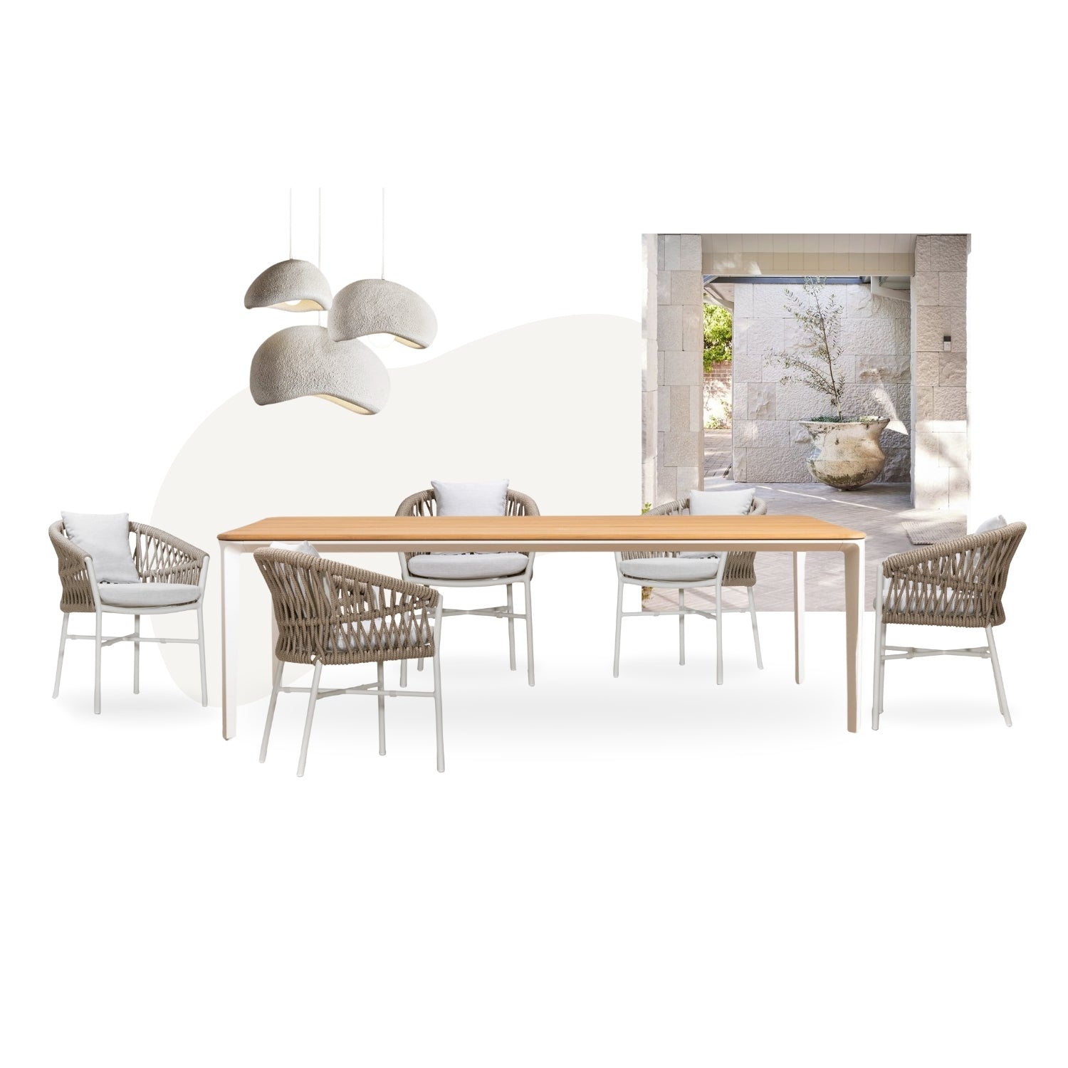 Elevate your outdoor dining with the Marco Teak Top Dining Table – a sleek and practical masterpiece that seamlessly blends modern aesthetics with functionality. Its slender frame and teak slatted top emit sophistication, while the elegantly curved edges add a touch of grace to your al fresco space.