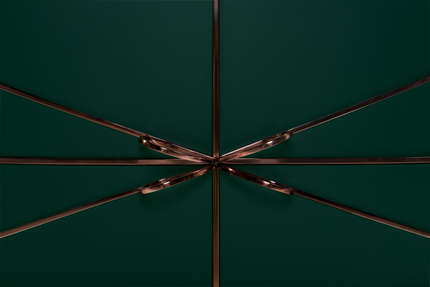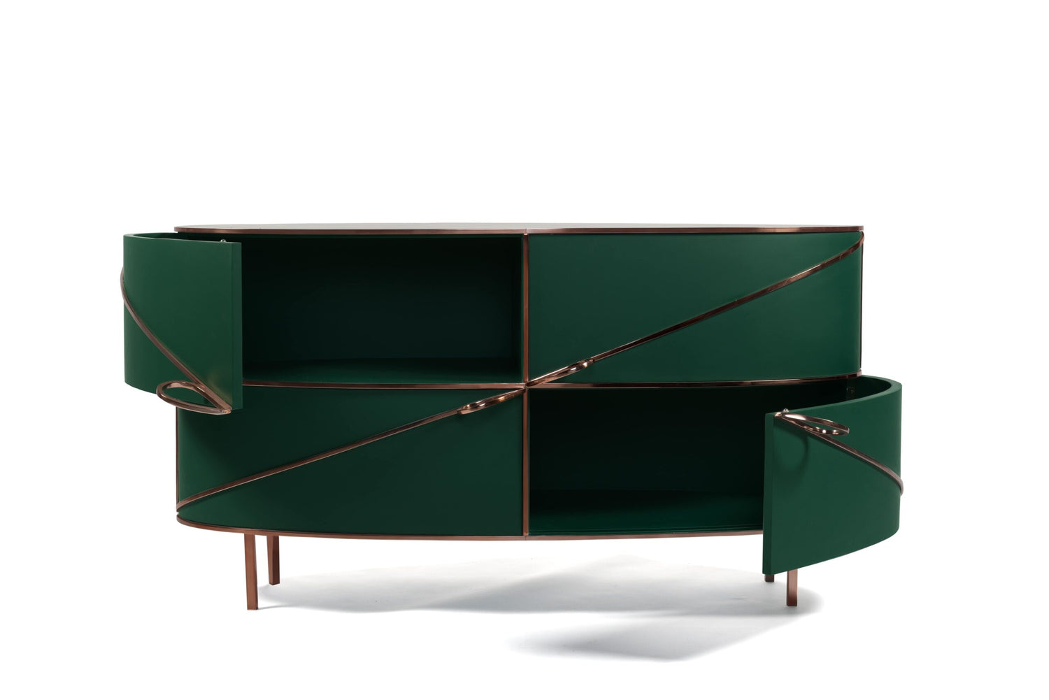 88 Secrets Sideboard Verde Rose is a deep green cabinet designed with sensuous, feminine lines and adorned with luxurious rose metal trims. A sophisticated statement piece for any space.