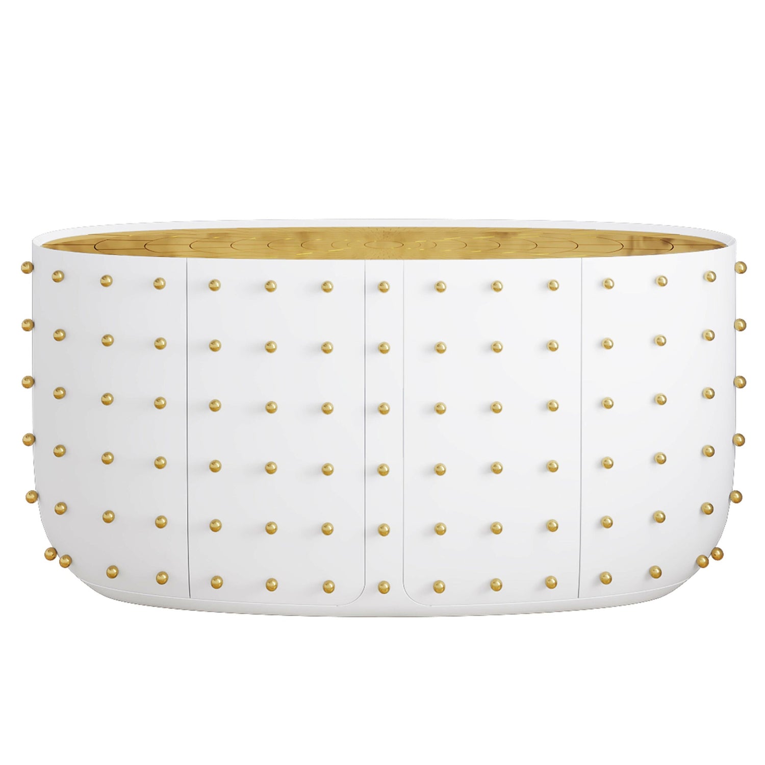 The gleaming brass spheres on the Oasis Sideboard are reminiscent of a marvelous white succulent. It has a brass top and pale blue interiors.