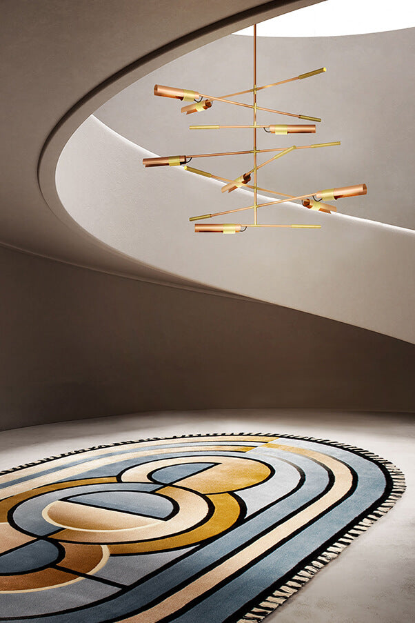 KLEOPATRA is a lounge rug inspired by ancient Egypt, not only for the chromatic choice but also for the linear and rigid graphics that served as the basis of language throughout history. In ancient times, communication was done through symbols, icons, and images, and that was the base for the Kleopatra rug. This modern lounge version of the KLEOPATRA rug is a must-have tapestry with its sky blue and pale mustard tones and fringes.