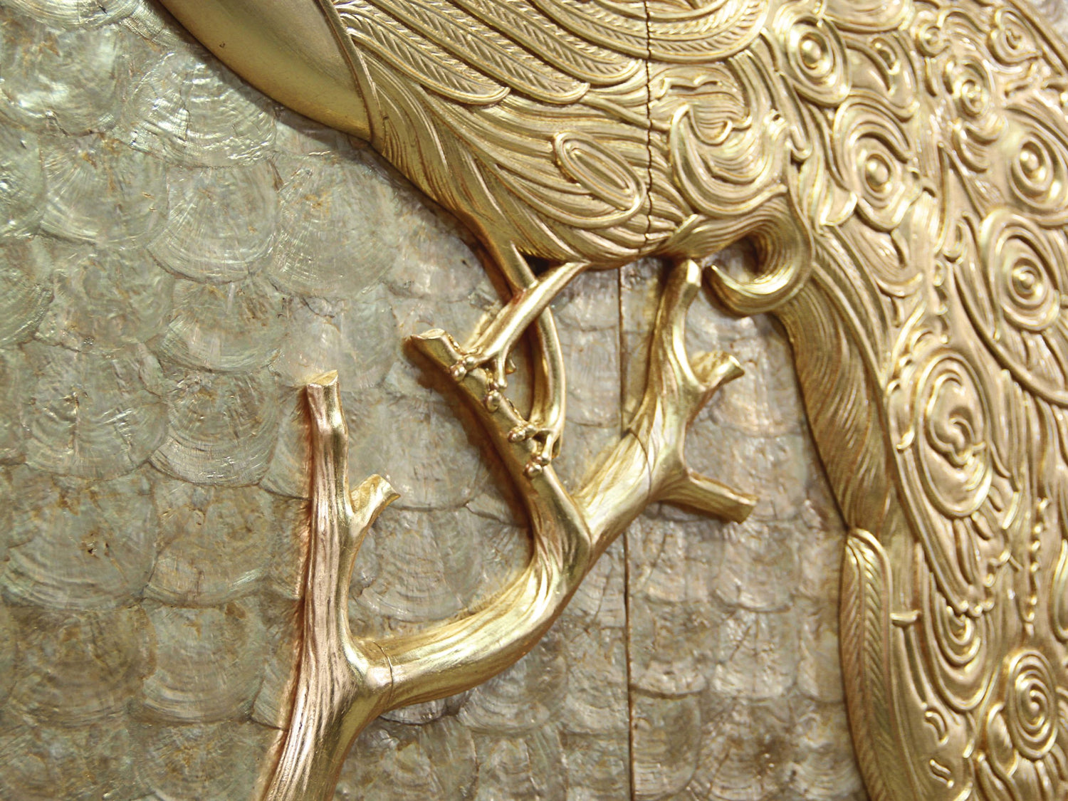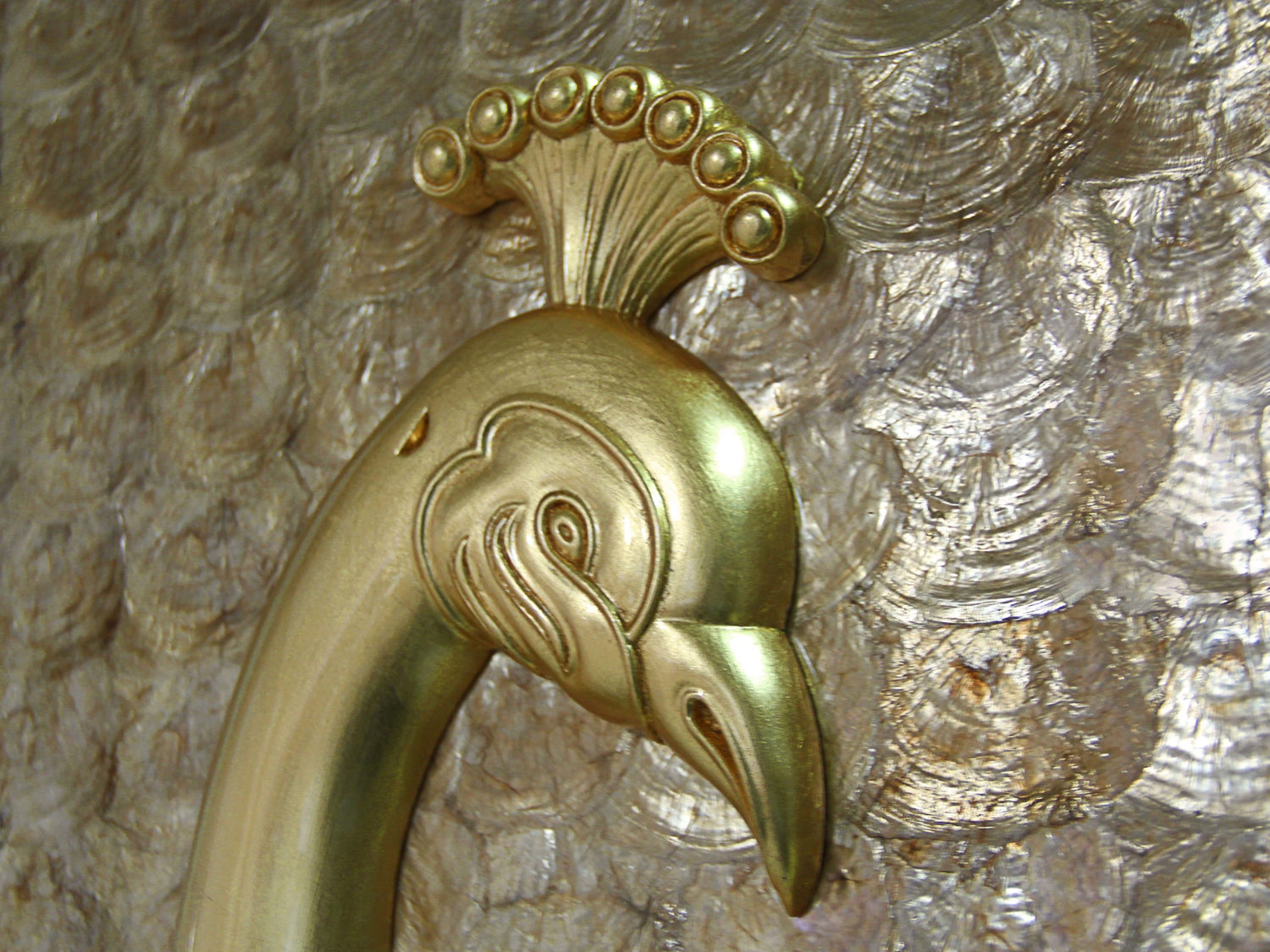 Elegantly designed by KOKET, the Camilia Armoire is inspired by the aristocratic palaces of Egypt. Adorned with mother of pearl and crowned by a hand-carved peacock, it brings regal charm and sophistication to any dining space.