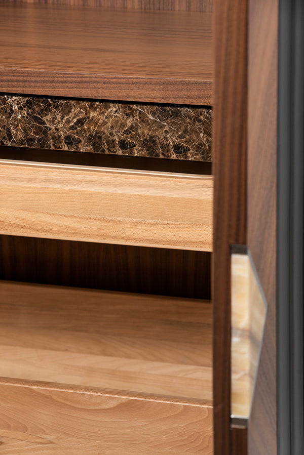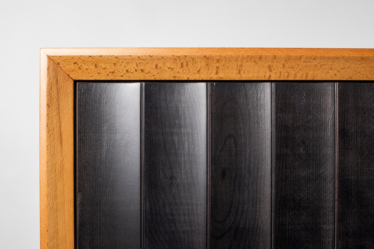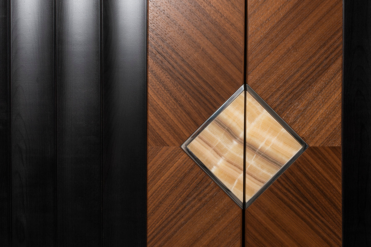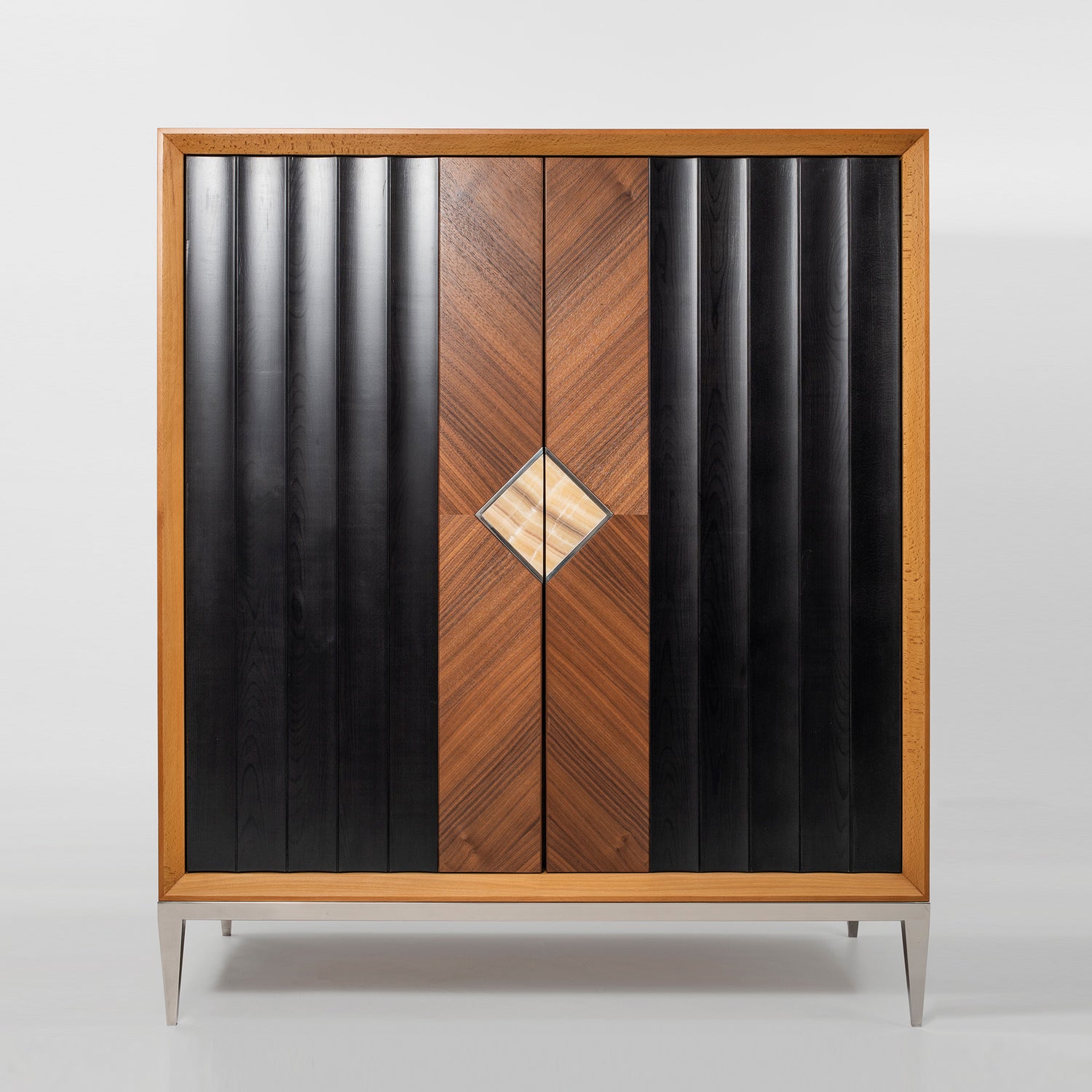 Materials: Plane wood veneer, black stained maple, American walnut veneer, stainless steel, honey onyx