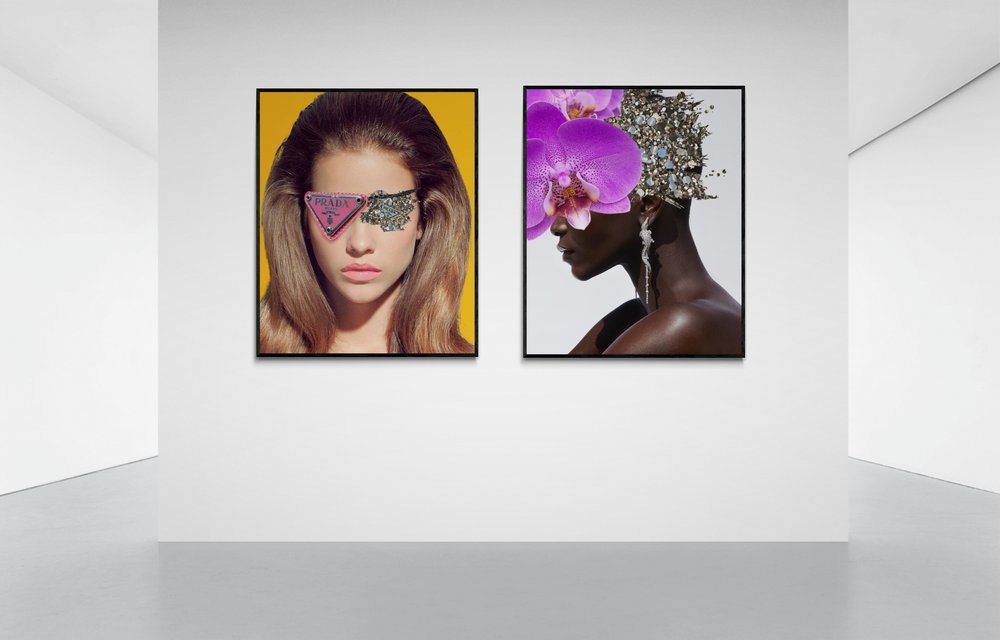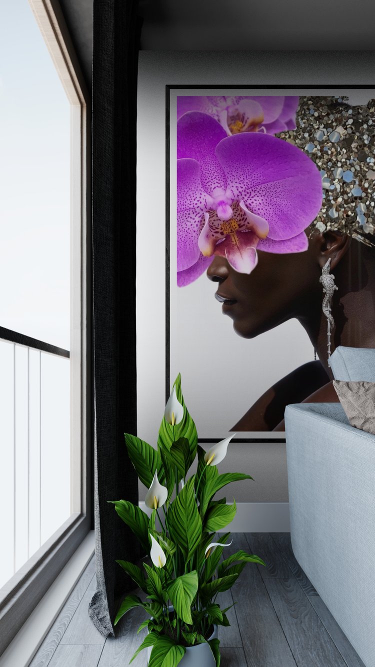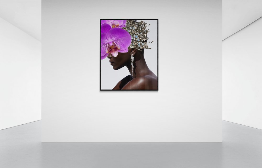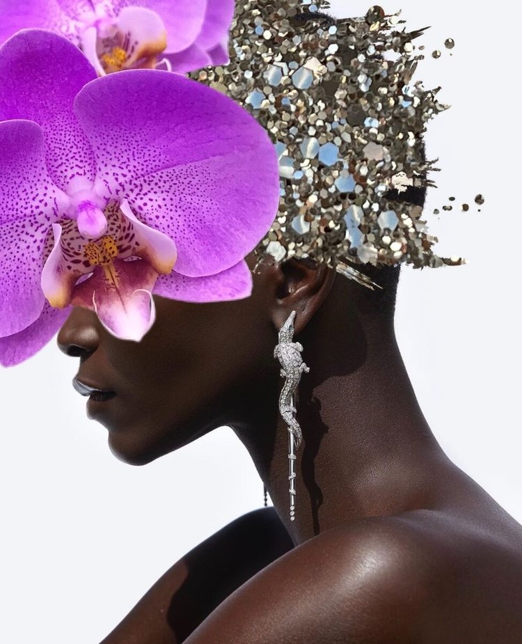 This is an original artwork by Amanda Johnstone, created using digital collage and layering. The source image is unknown but originates from a magazine jewelry campaign, combined with an original photograph of an orchid and glitter studies by Amanda Johnstone.