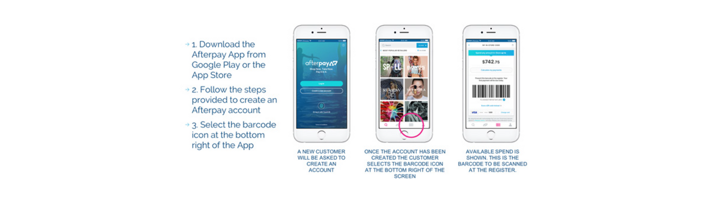 The Afterpay in-store process starts from your mobile phone and takes under 2 minutes to create an account. If you are already an Afterpay customer, simply download the App and sign in.