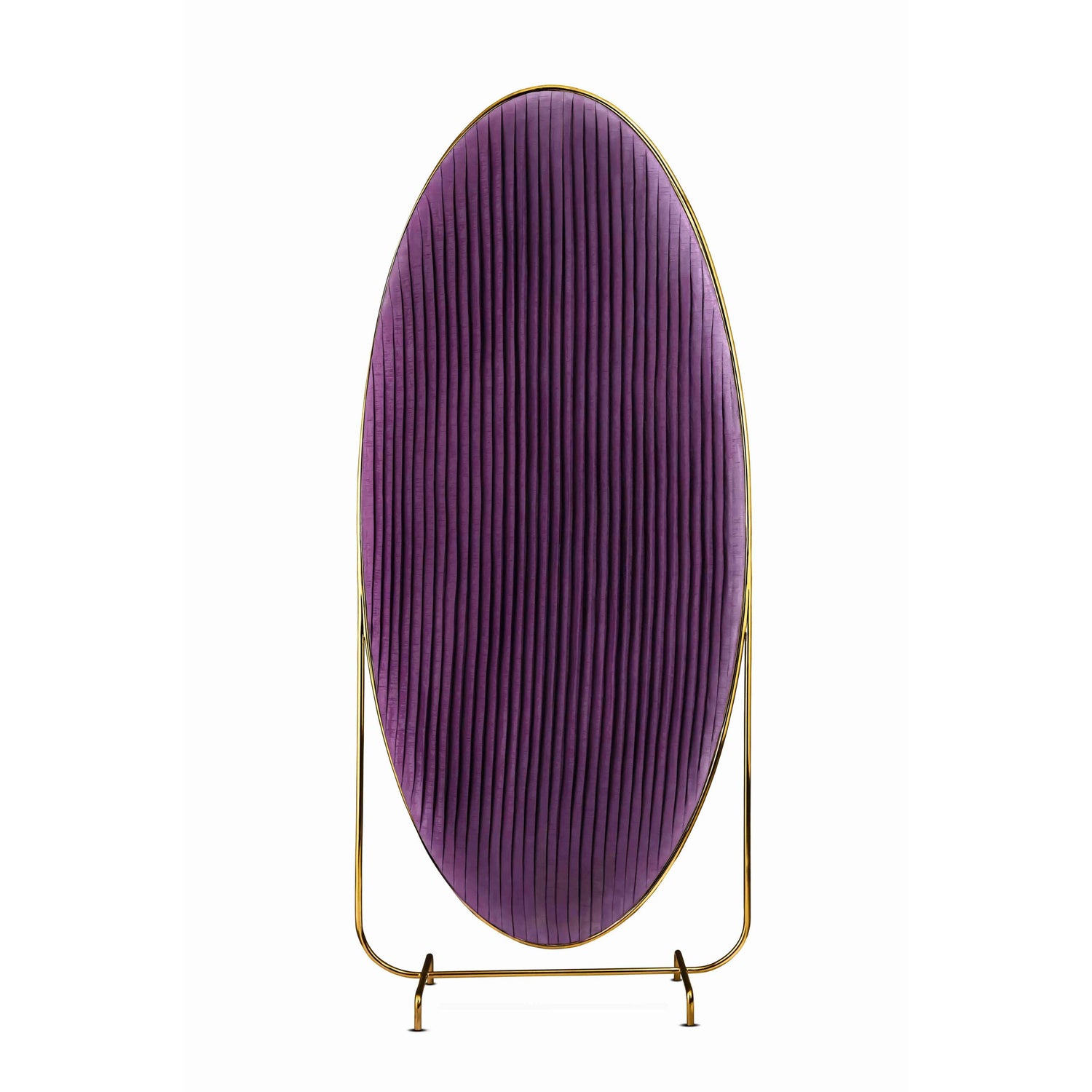 88 Secrets Screen Viola is a tall and elegant room divider featuring a sleek metal frame and meticulously pleated purple silk fabric, bringing sophistication and charm to any space.