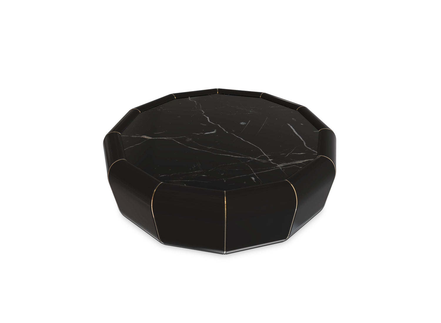 The Darian takes up a new form, this time in a lavish center table. A proof that precise knowledge and expert craftsmanship can create a luxurious silhouette. Involving the glossy black lacquered wood are fine gold plated brass lines and it’s finished off with a circular nero marquina marble top. A sumptuous piece that blends the splendor of art with a strong personality.
